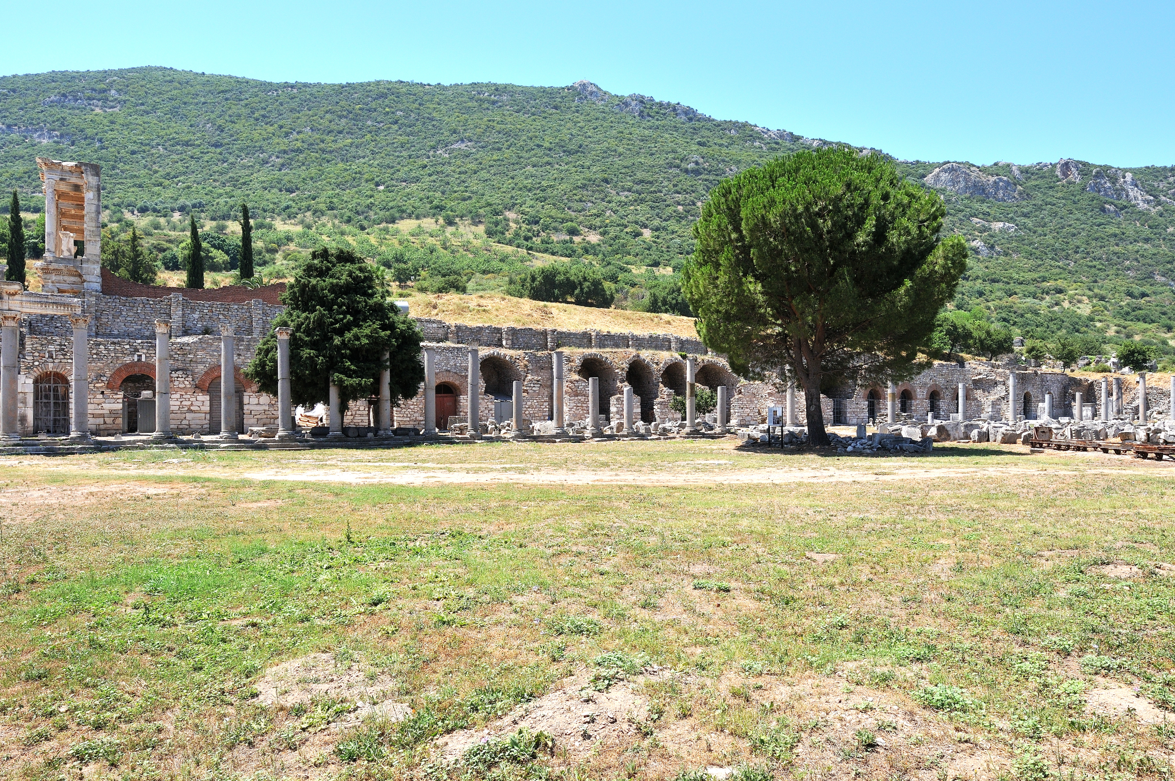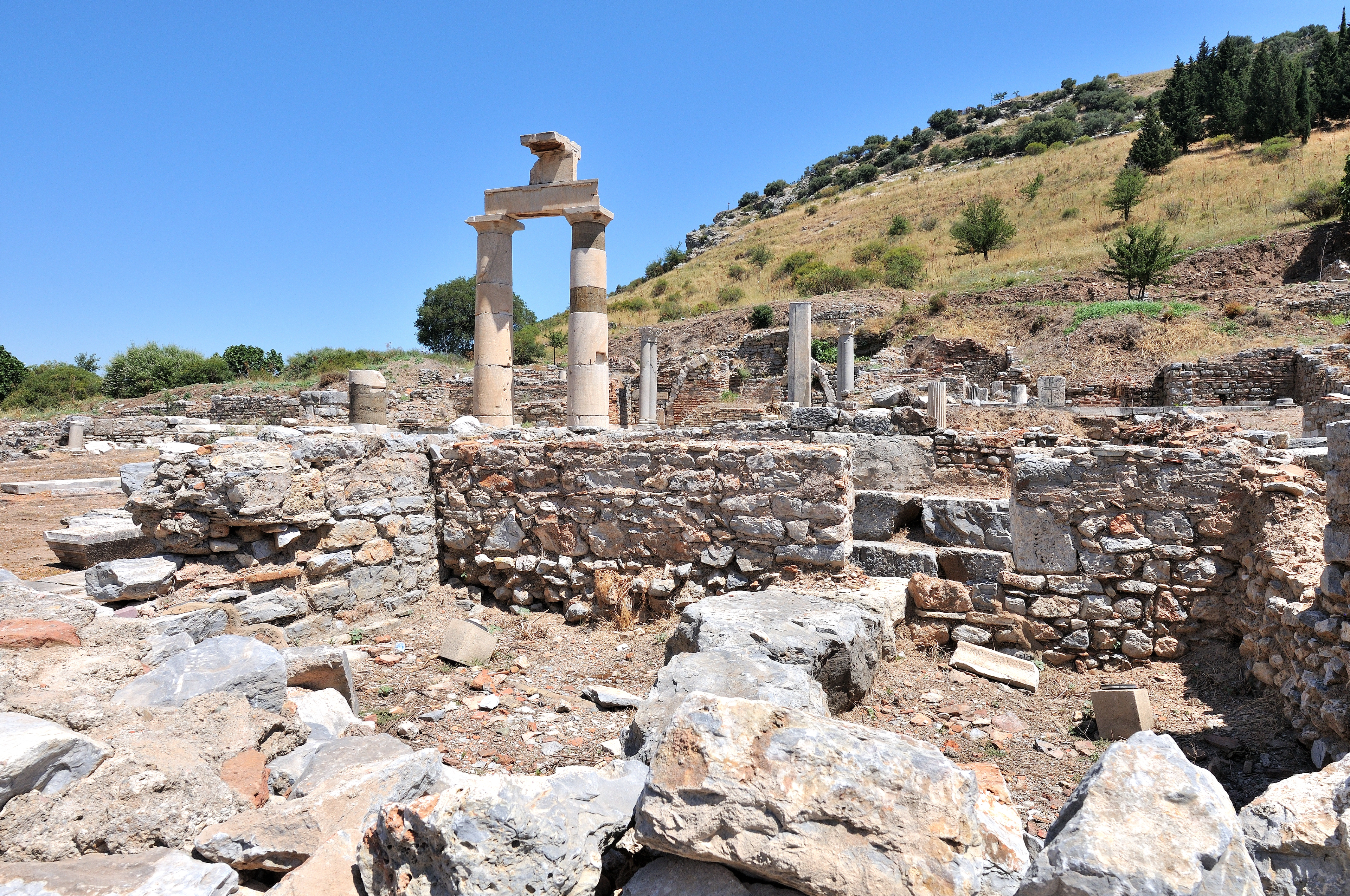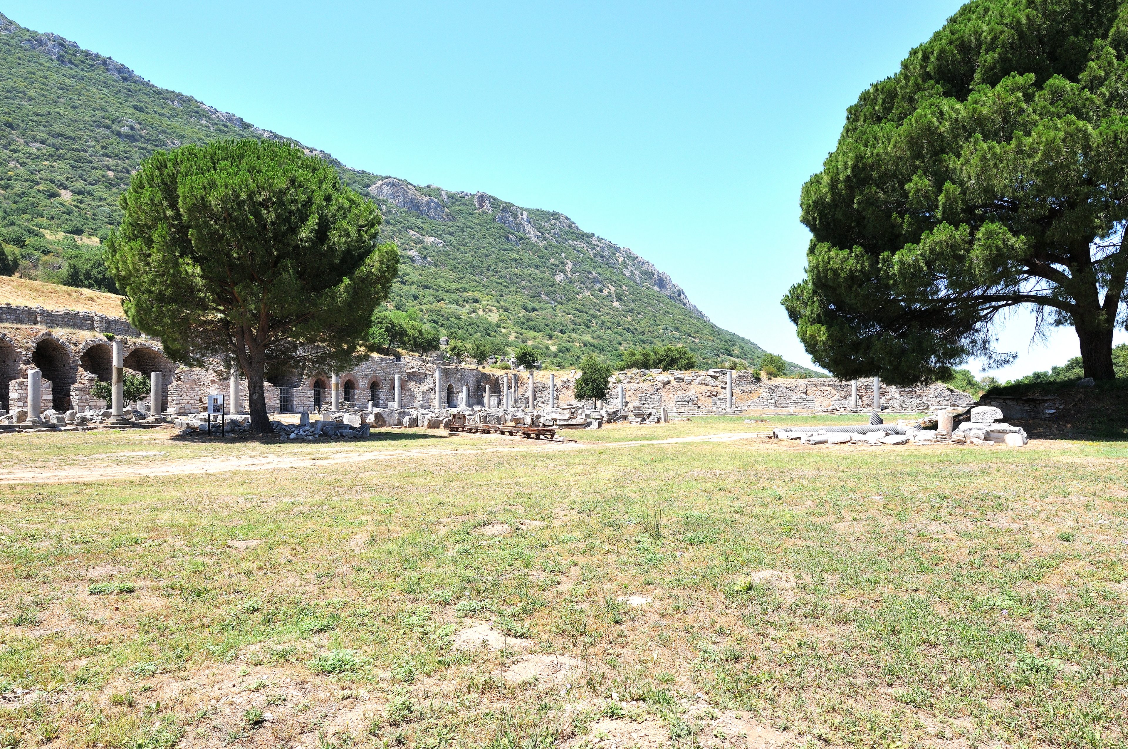 | ドミティアヌス神殿 [Domitianus Tapınağı] (11:48) この広場は、商業を中心としたアゴーラ (広場)で、この都市で一番賑やかな場所だった。 広場の奥には台地の上にローマ帝国第11代皇帝ドミティアヌスに捧げられた神殿があったが、現在は礎石以外は数本の二階建て構造の柱が残っているのみ。 生前、ドミティアヌス皇帝は独裁者で残酷であったため、彼を恐れるあまり至る所に彼の名前付けた神殿や像が造られたが、彼の死後、彼の名前が付いた建物や像などは全て破壊された。 (発掘後修復された物もある) 「南」MAPLay. 2 p |