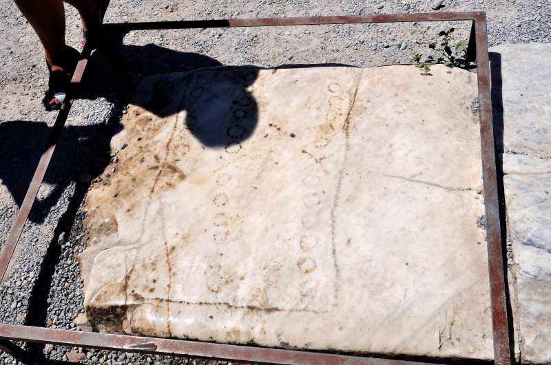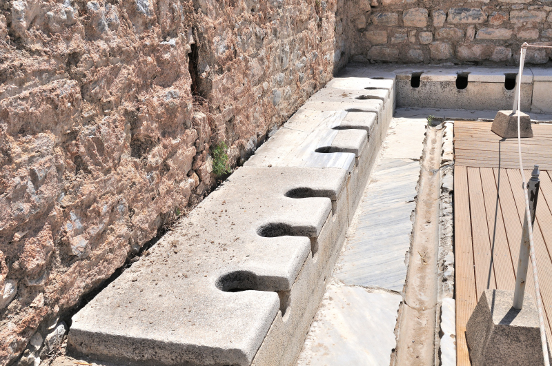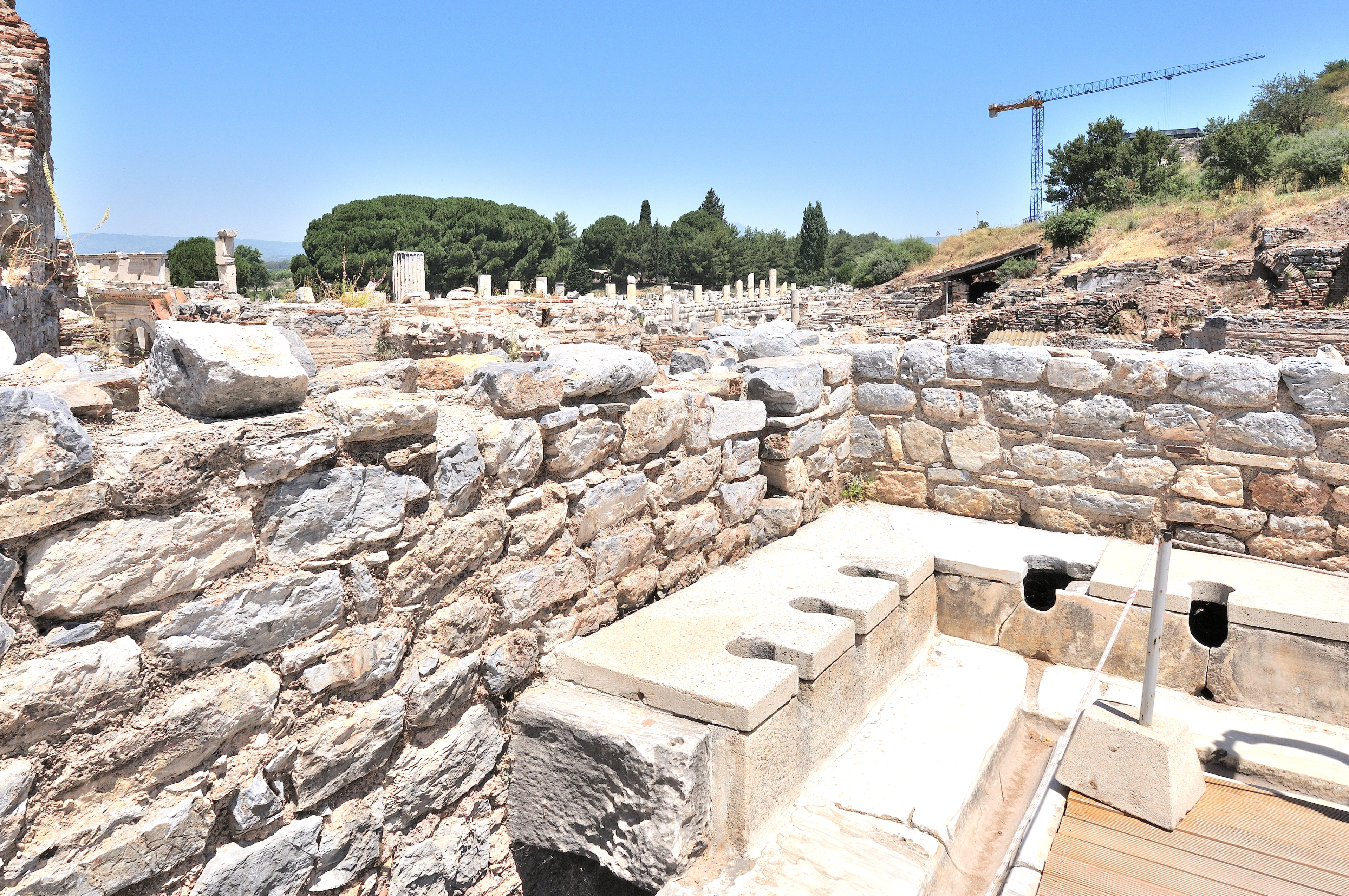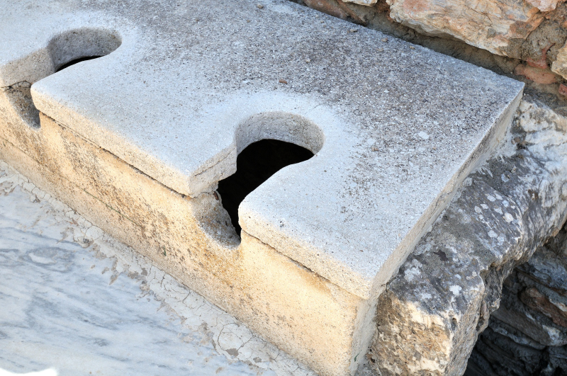 | 2000年前の公衆トイレ (12:14) かつては天井があり、床はモザイクで壁には大理石のタイルが貼られていた。 中央台座では、外部への消音効果とリラクゼーションを兼ねた、ハープと笛による音楽演奏が行われていた。 「東」MAPLay. 3 B |