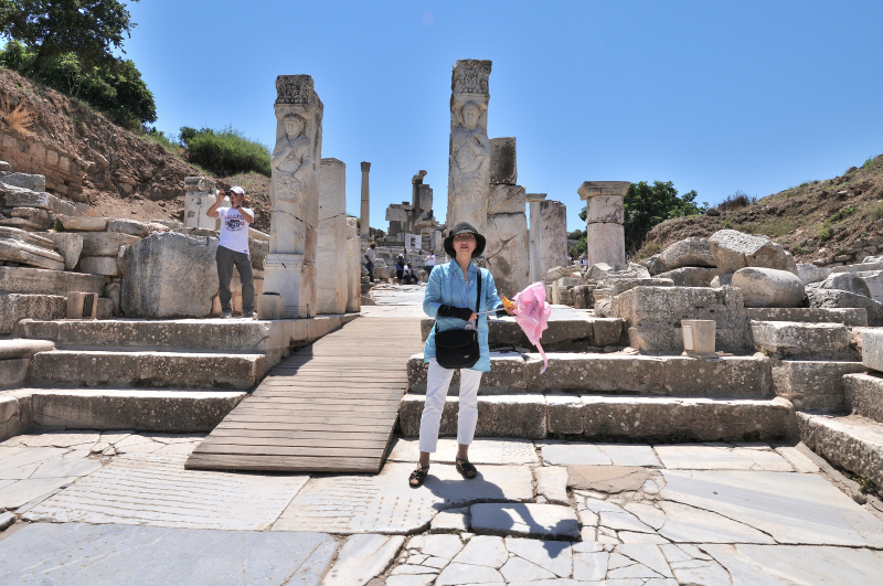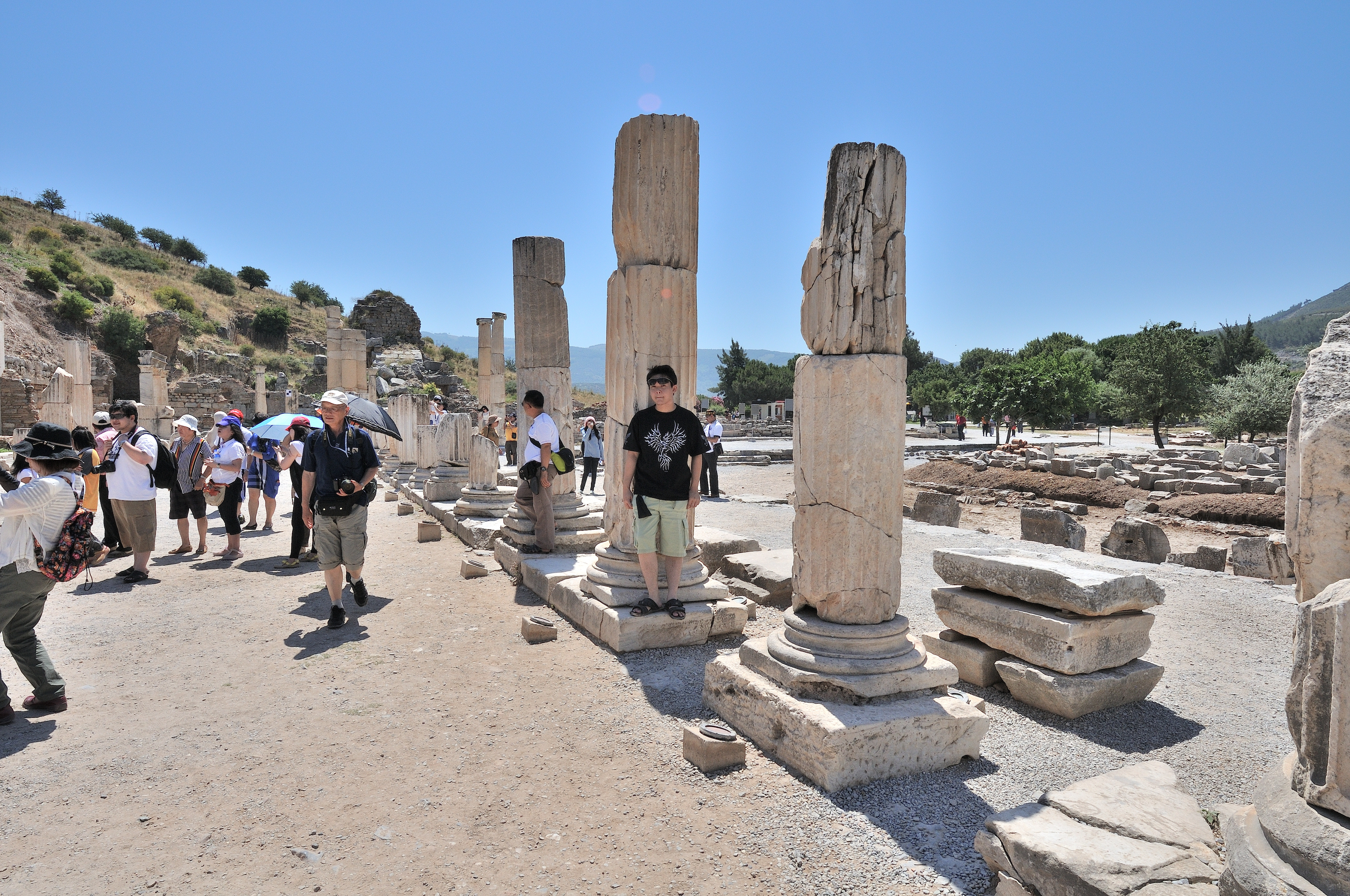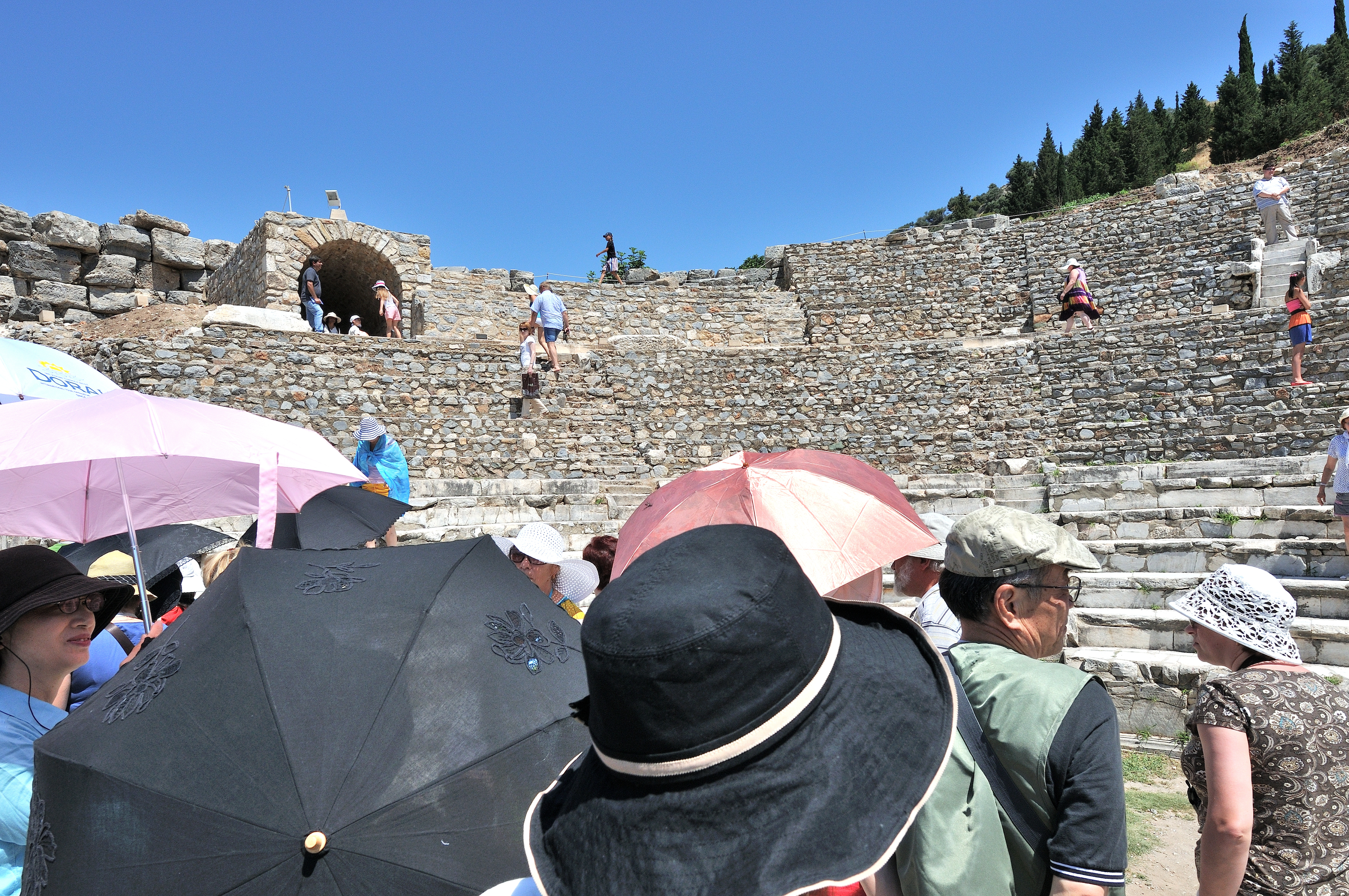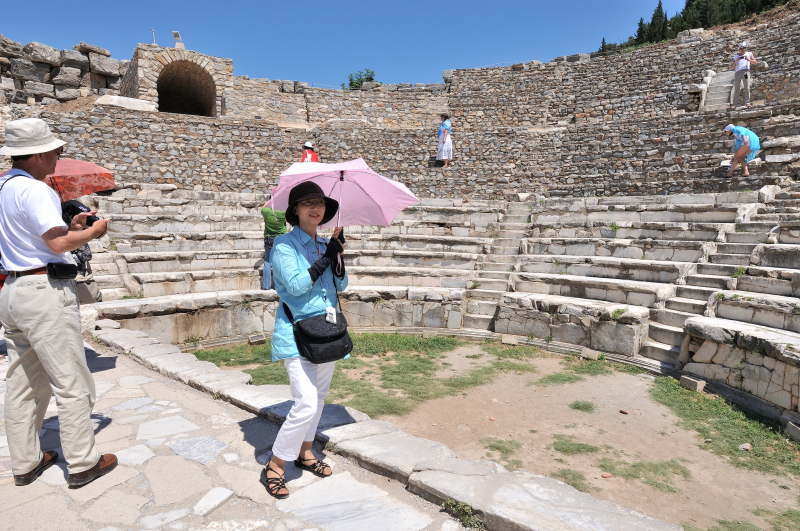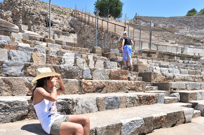 | エフェス円形劇場 [Efes Anfi Tiyatro] (12:42) 石段に座って写真を撮っている女性の両腕に、漢字で “ 飛行機 ” と書いてあったので、『 あっ飛行機と書いてある 』 と言うと彼女は振り向いて 『 I want to be an engineer because I love airplanes. So,I'm writing "飛行機" to the arms. 』 と応えてくれた。 どこの国の人で、なぜ日本語で書いてあるのかは不明。 「東北東」MAPLay. 3 N |
