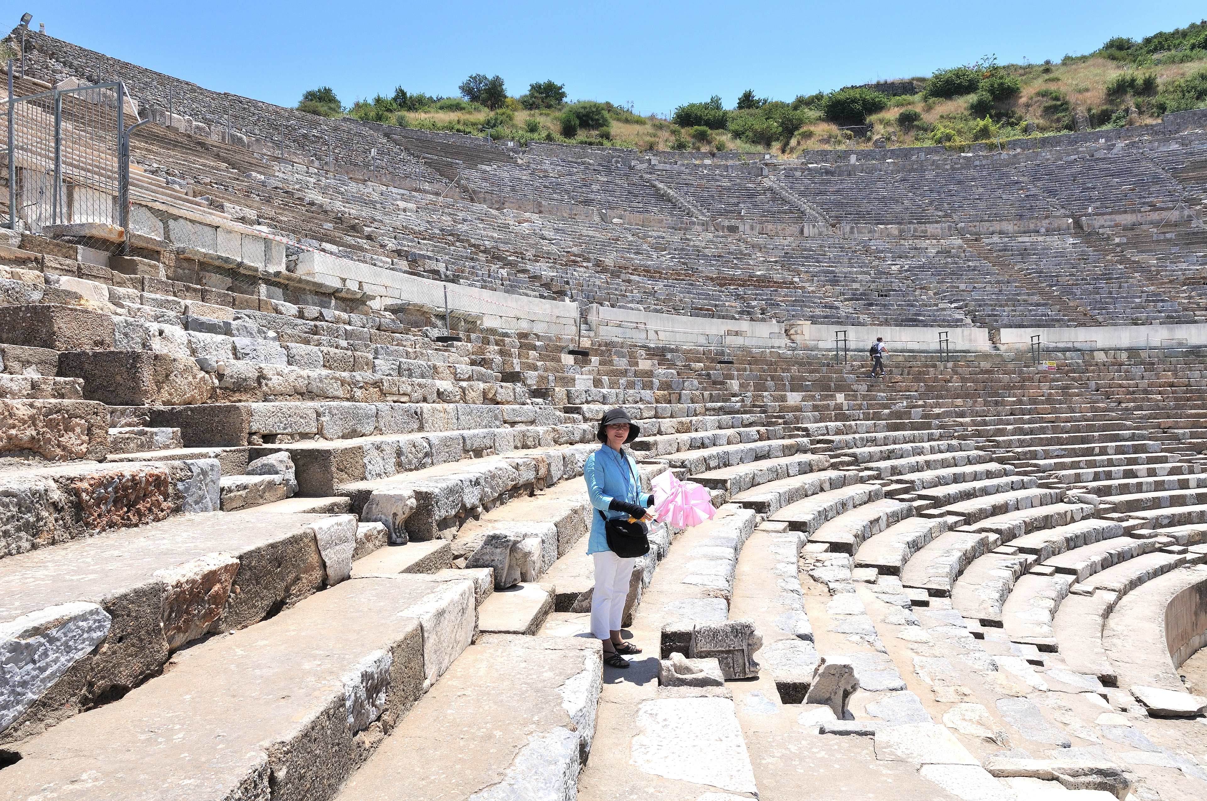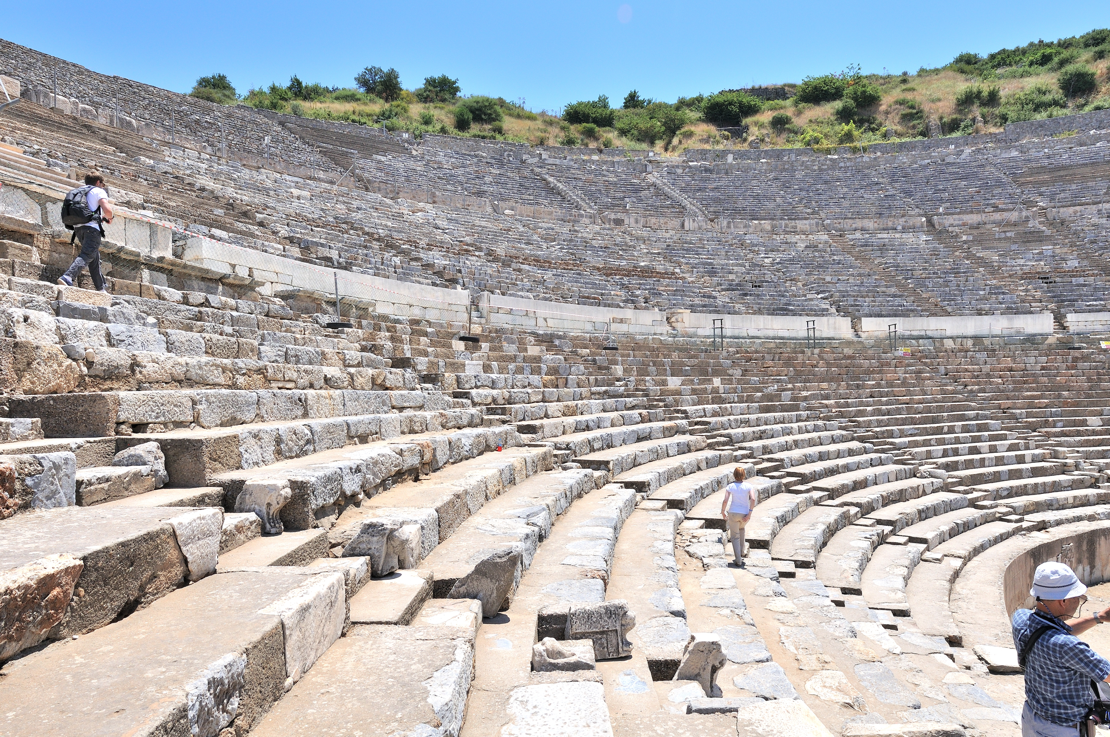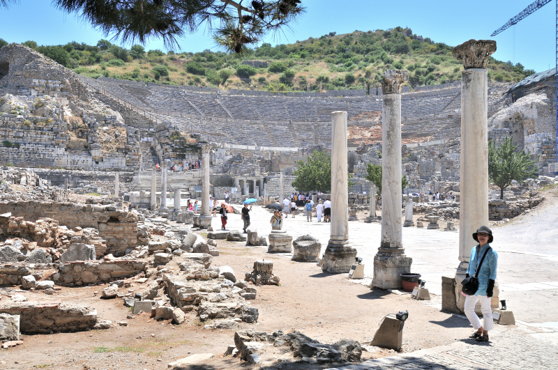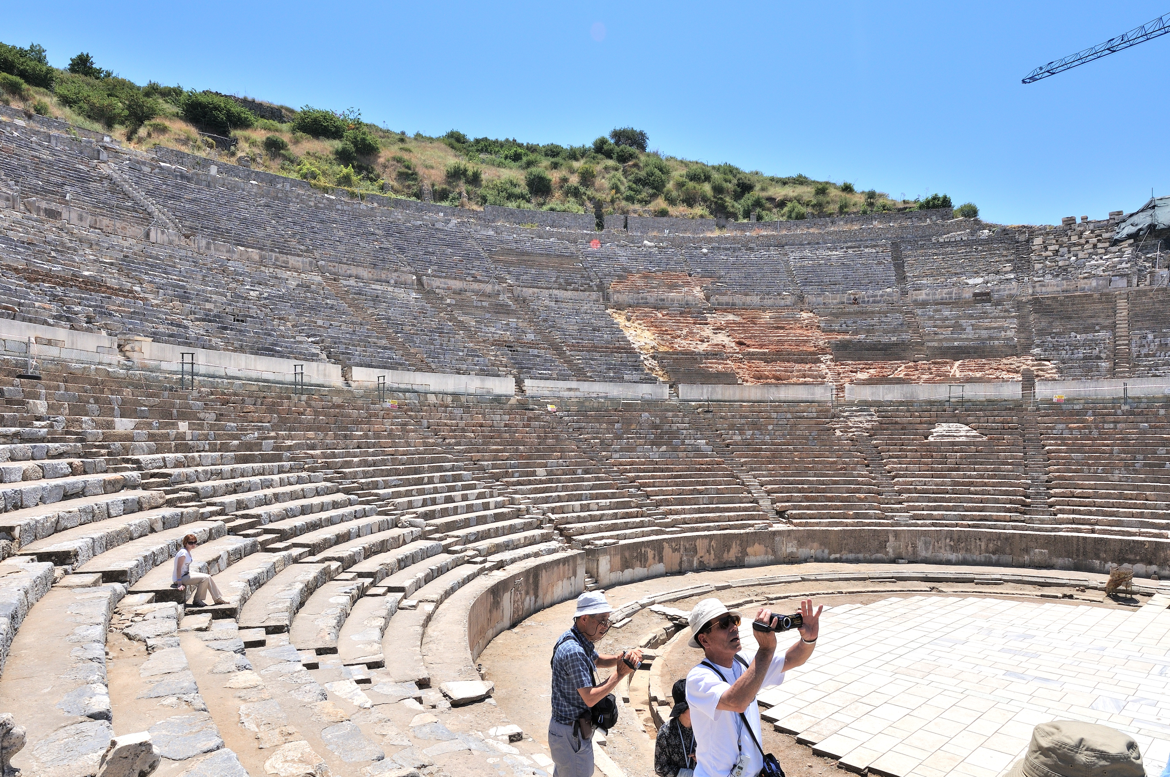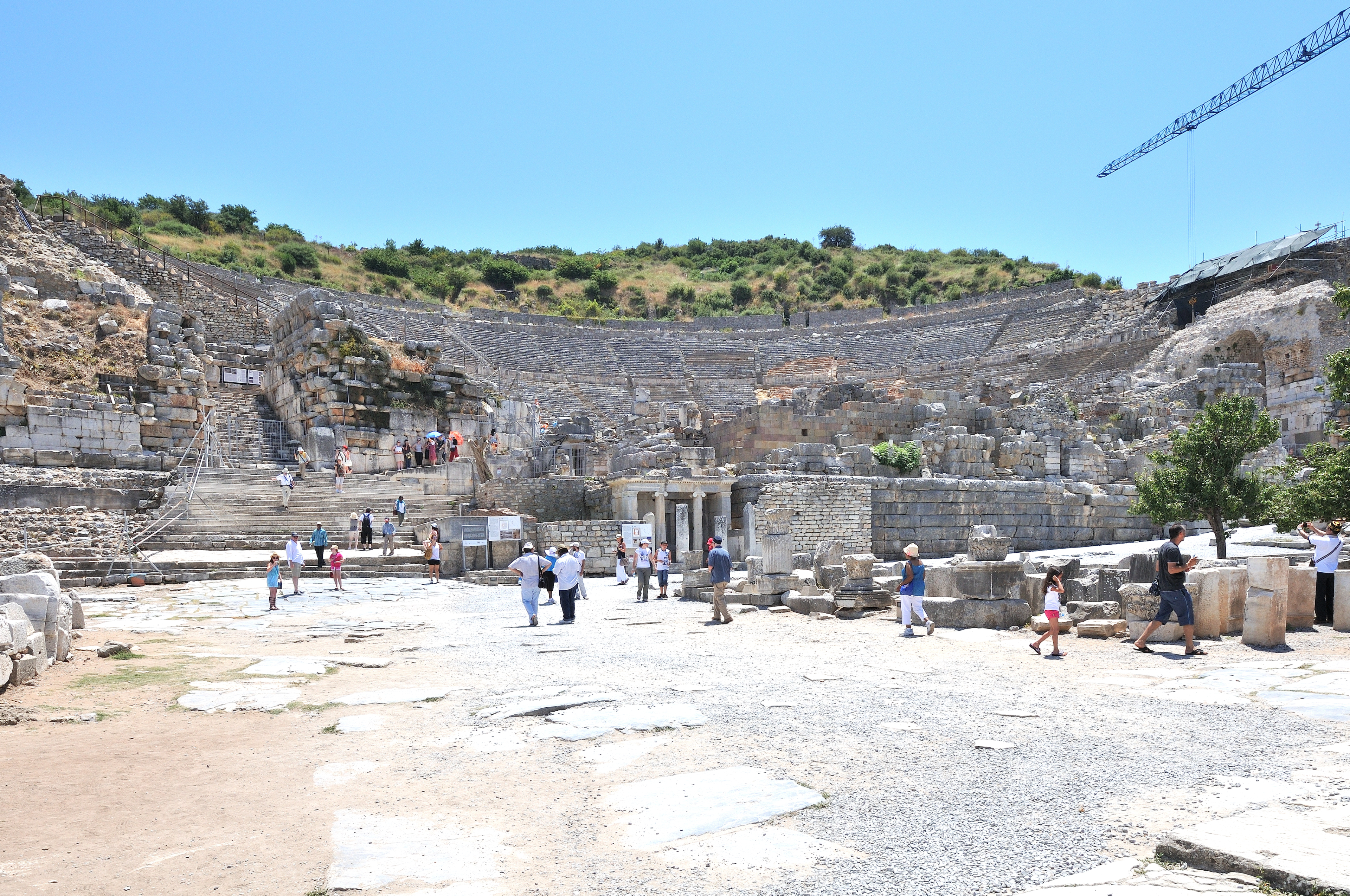 | エフェス円形劇場 [Efes Anfi Tiyatro] (12:34) 二万四千人収容できたと言われる大劇場。 昔、ローマの町では人口を計算するのに劇場の収容人数×10倍が、ほぼその町の人口に相当するとして計算されていたため、約25万人の人々がここで暮らしていたものと推定できる。 当初からこの大きさであったのではなく、町の人口の増加に連れて徐々に増改築を繰り返し、今日の姿になるまで約1000年 (紀元前4世紀~紀元後6世紀) の歳月が費やされたと言われている。 「東南東」MAPLay. 3 K |