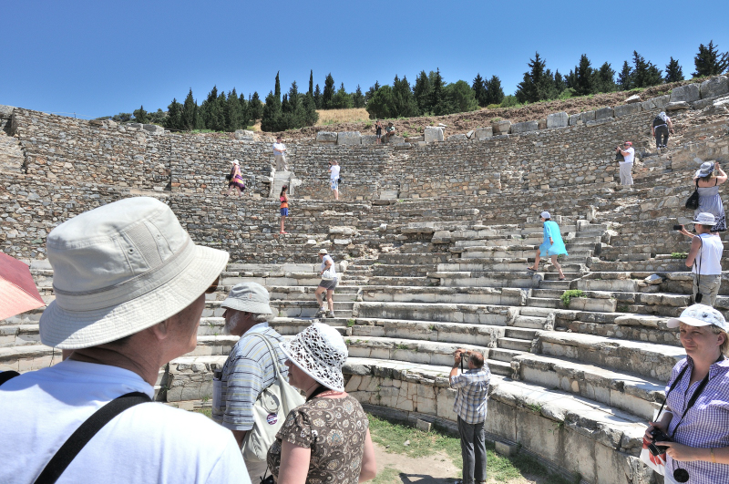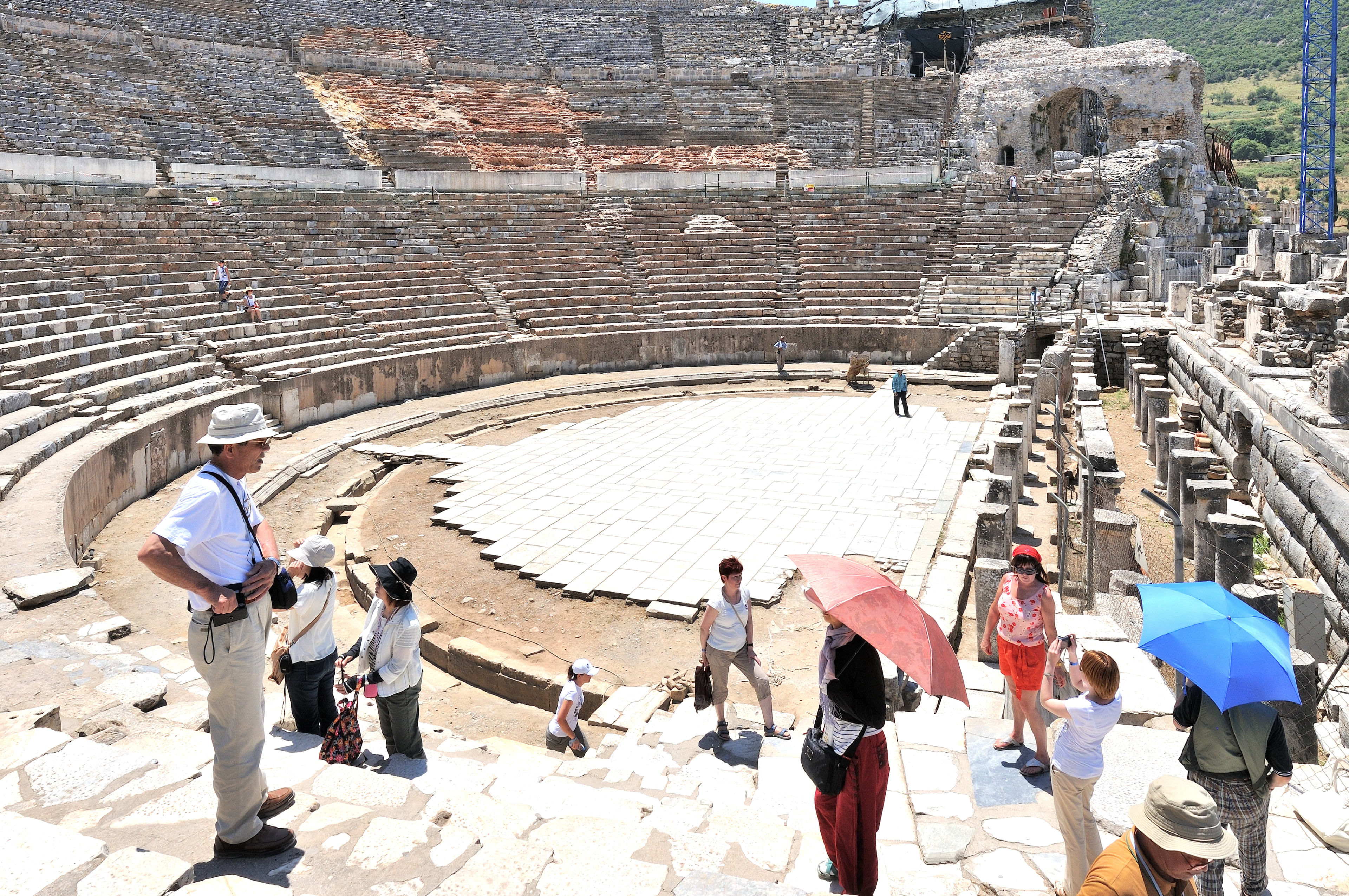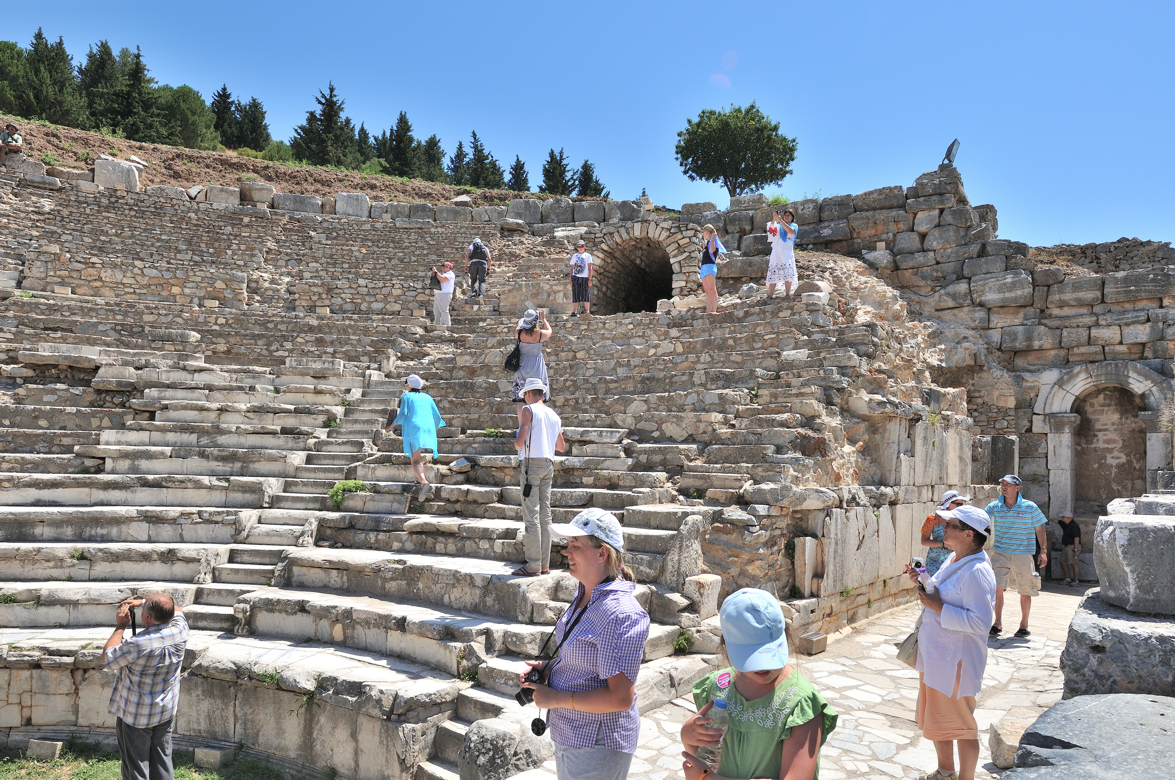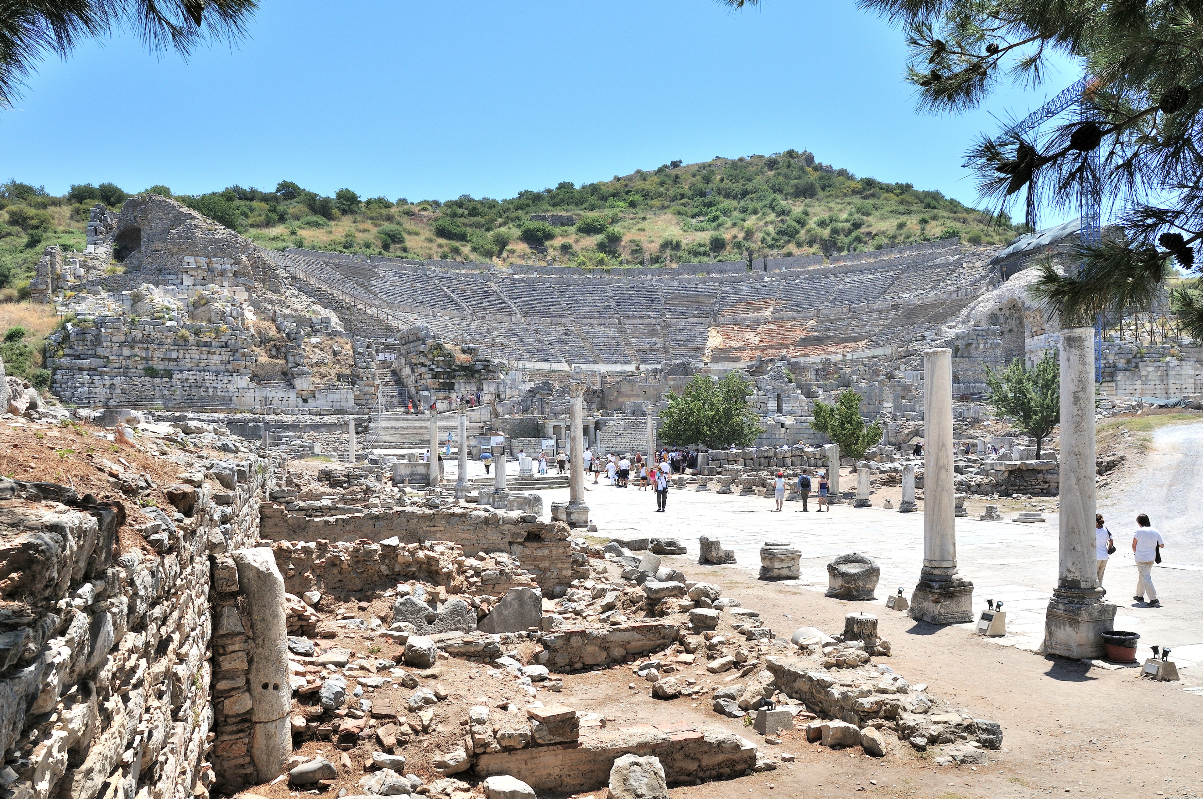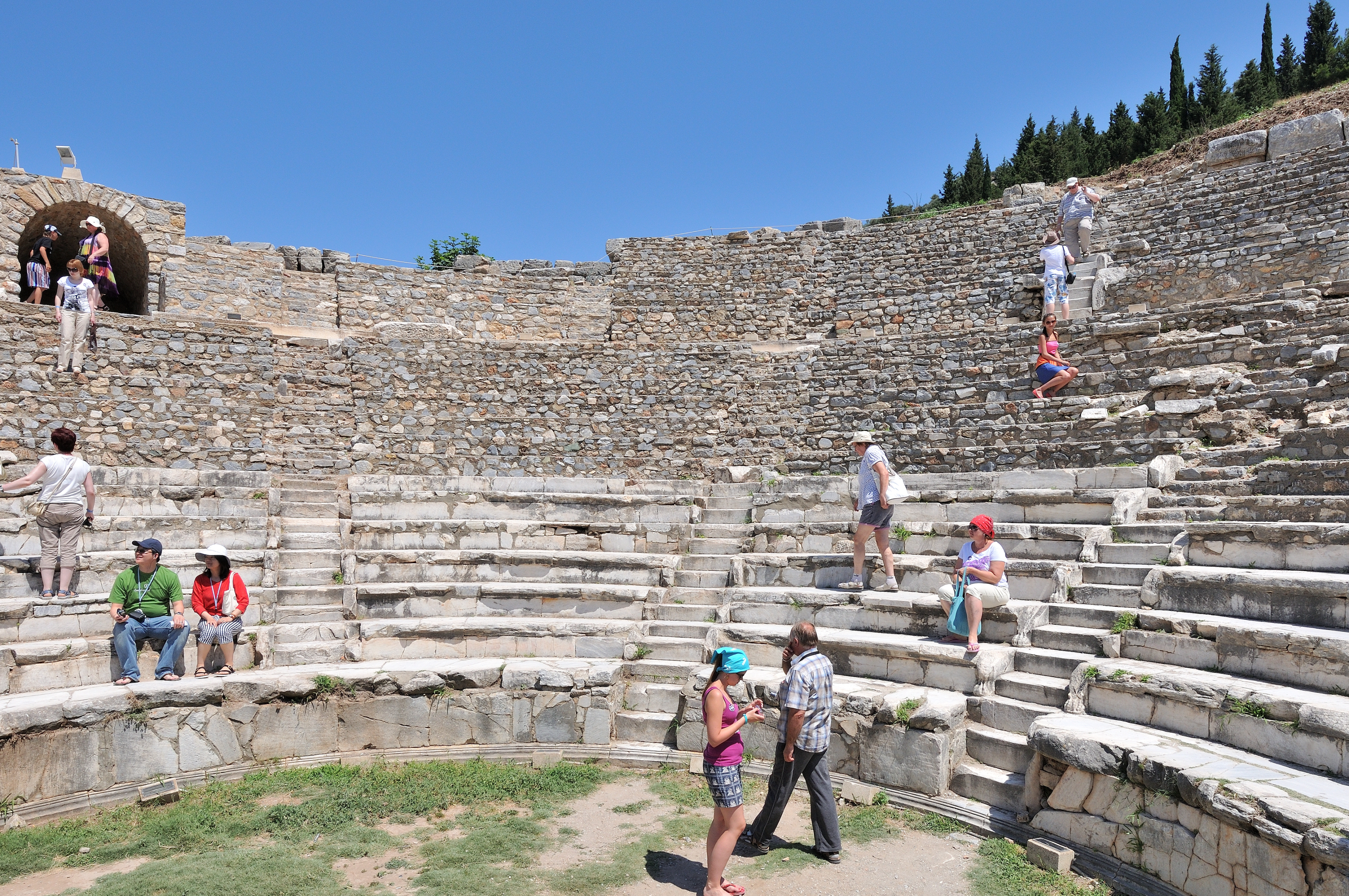 | エフェス円形劇場 [Efes Anfi Tiyatro] (12:34) 二万四千人収容できたと言われる大劇場。 昔、ローマの町では人口を計算するのに劇場の収容人数×10倍が、ほぼその町の人口に相当するとして計算されていたため、約25万人の人々がここで暮らしていたものと推定できる。 当初からこの大きさであったのではなく、町の人口の増加に連れて徐々に増改築を繰り返し、今日の姿になるまで約1000年 (紀元前4世紀~紀元後6世紀) の歳月が費やされたと言われている。 「東南東」MAPLay. 3 K |
