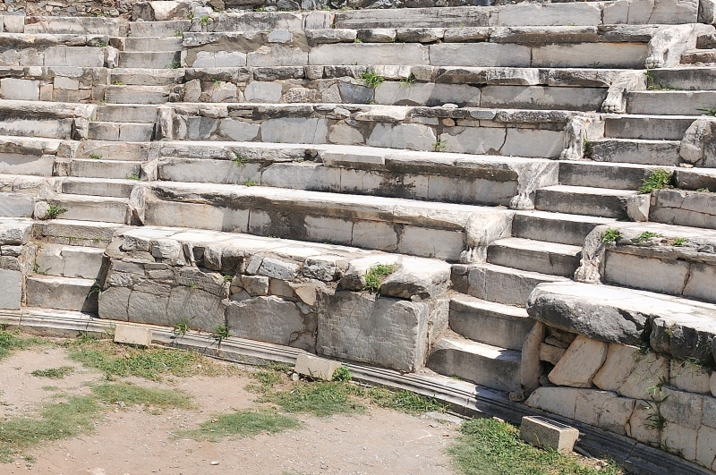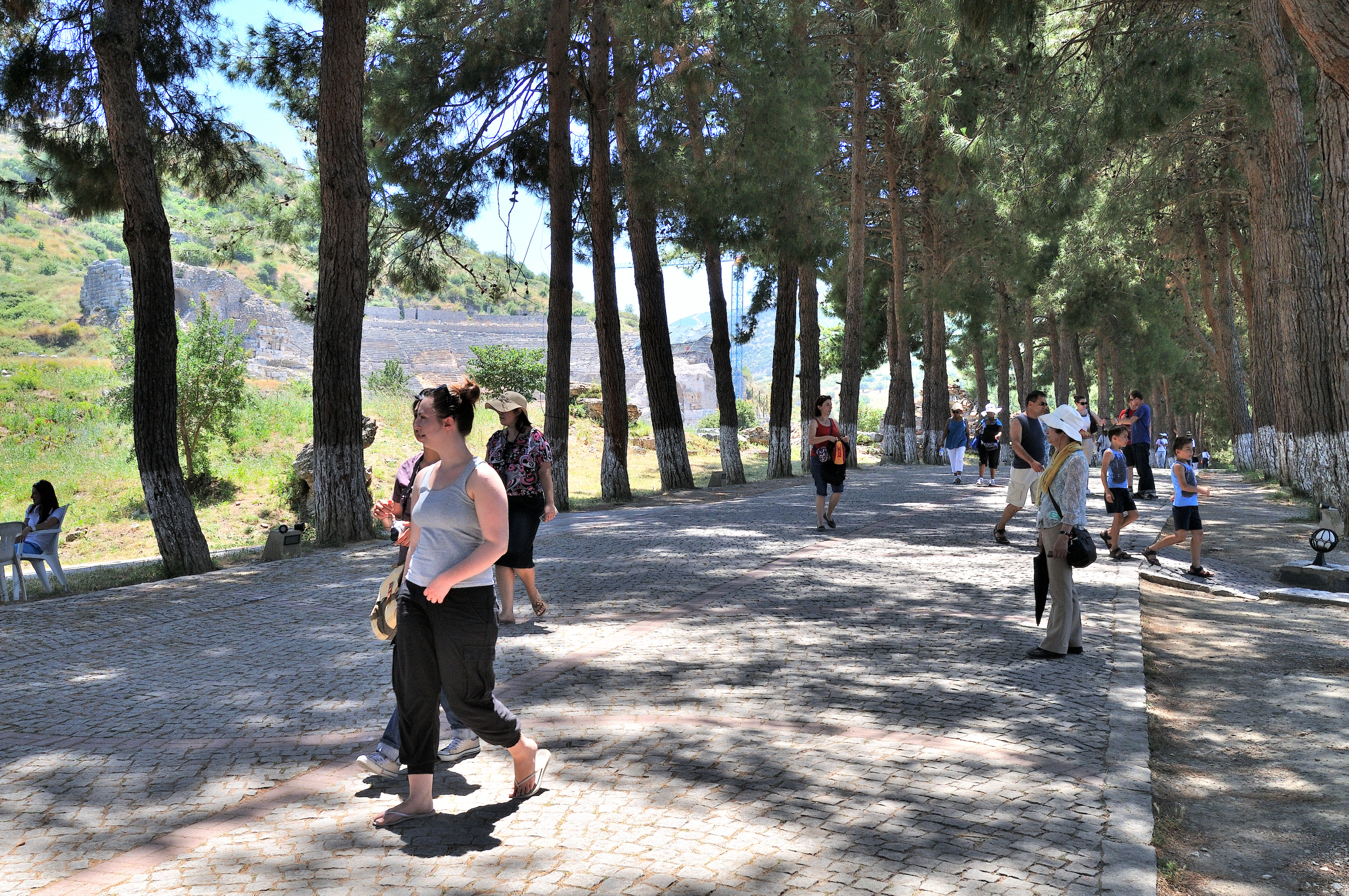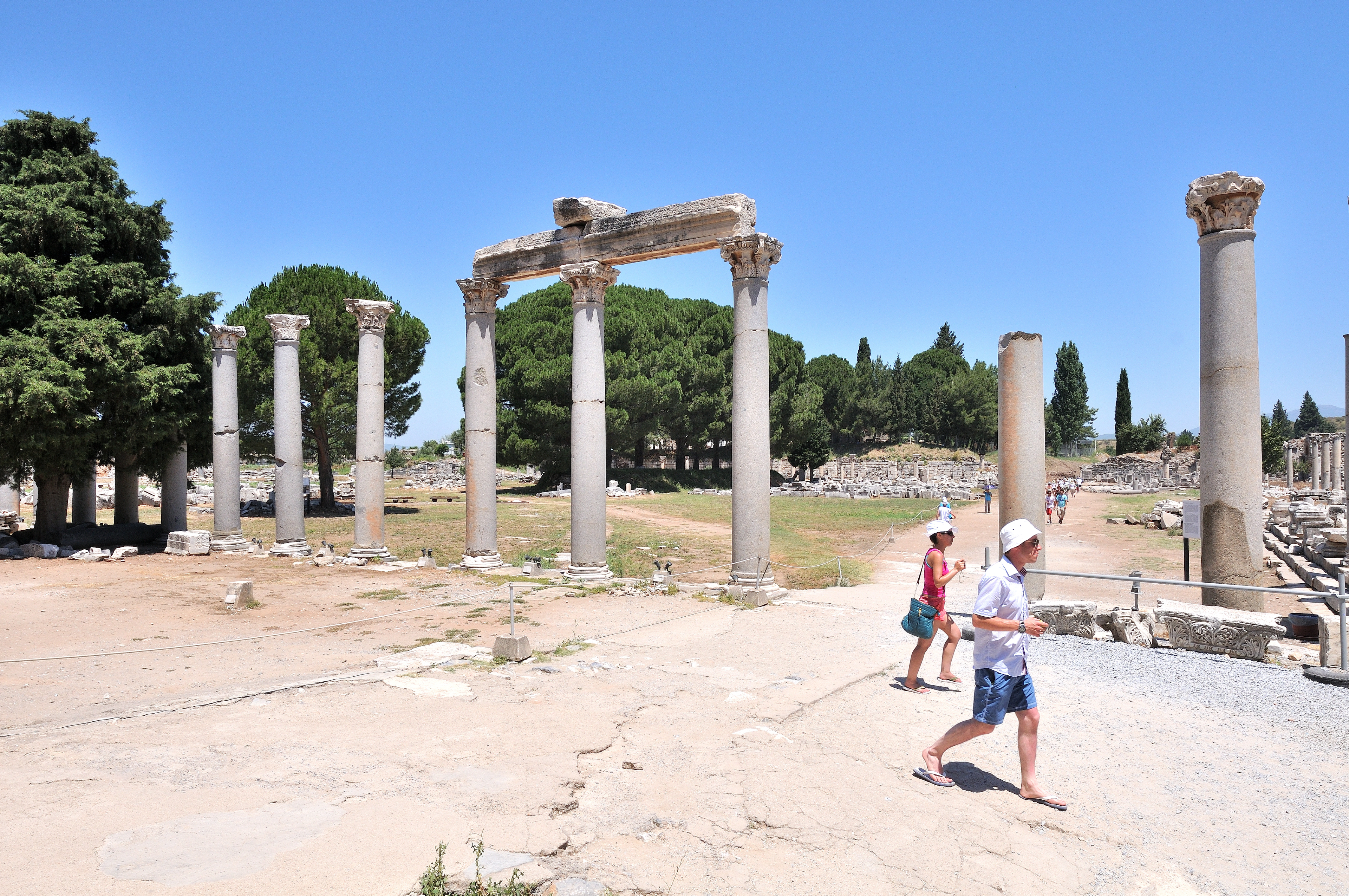 | アルカディアン通り [Arcadiane Caddesi] (12:44) 円形劇場の入口階段から眺めたアルカディアン通り。 かつて、通りの突き当たりは港になっていたが、現在は土砂で埋まり沼地になっている。 最盛期、夜は列柱に明かりが灯され、女王クレオパトラがアントニウスと連れだって歩いたとも言われている。 ちなみに当時、街灯があったのはアレクサンドリアとローマだけだった。 「西北西」MAPLay. 3 M |