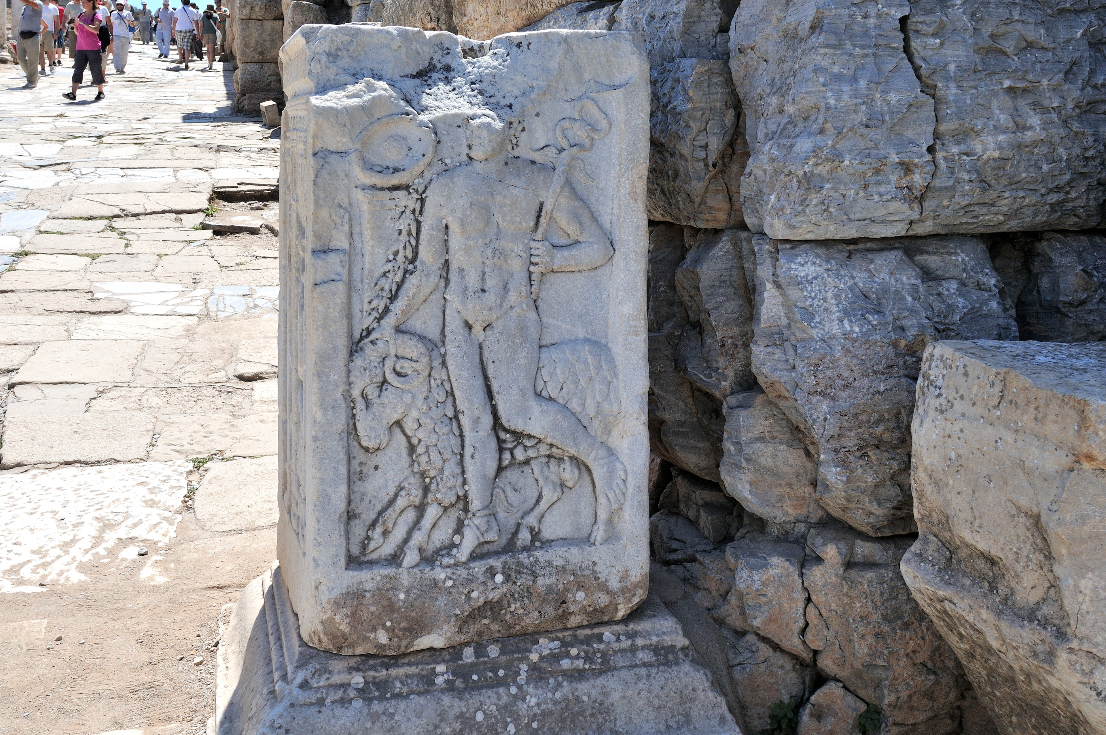 | ヘルメスのレリーフ (11:49) ヘルメスは商売、盗み、賭博、競技、旅人の守護神で、アポロンの羊の群れから1匹無断で拝借したことから、彼は常に雄の羊を連れた姿で作られている。 ちなみに、かの有名な "エルメス" のブランド名は "ヘルメス" から拝借したものと言われている。 「南東」MAPLay. 2 p |