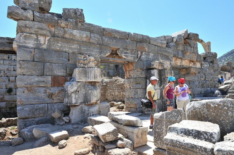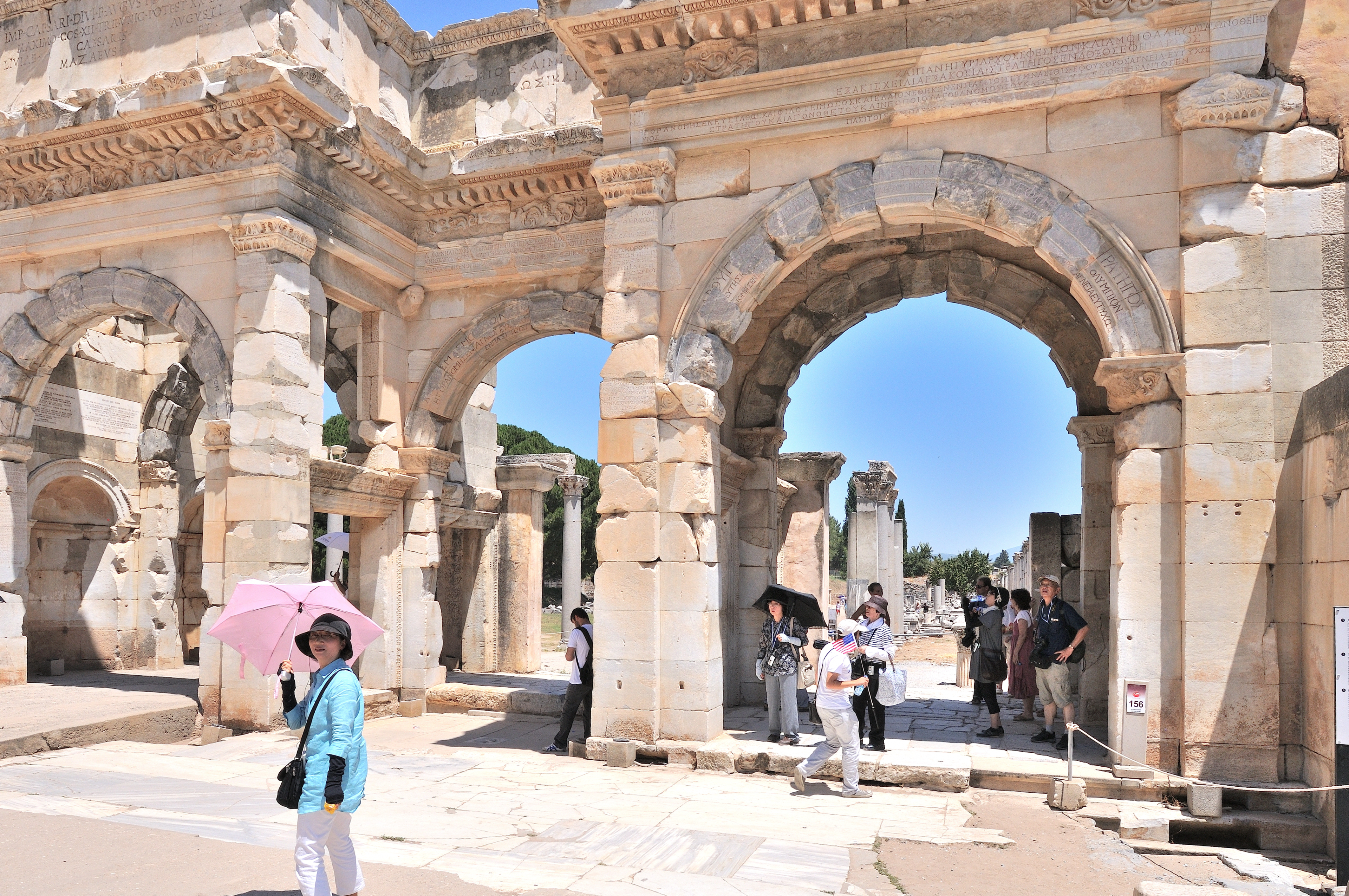 | ハドリアヌス神殿 [Hadrian Tapınağı] (12:09) 小さいながらエフェスで一番豪華な神殿。 2世紀のローマ皇帝ハドリアヌスに捧げられた建物で、奥の門の上には両手を広げたメドゥーサが彫られている。 メドゥーサは多神教時代のお守りだったが、キリスト教時代になってからは全て破壊された。 手前のアーチの中央にはエフェスに幸運をもたらす、幸運の女神ティケ [Αγαλμα της Τύχης] が彫られている。 「北」MAPLay. 3 A |