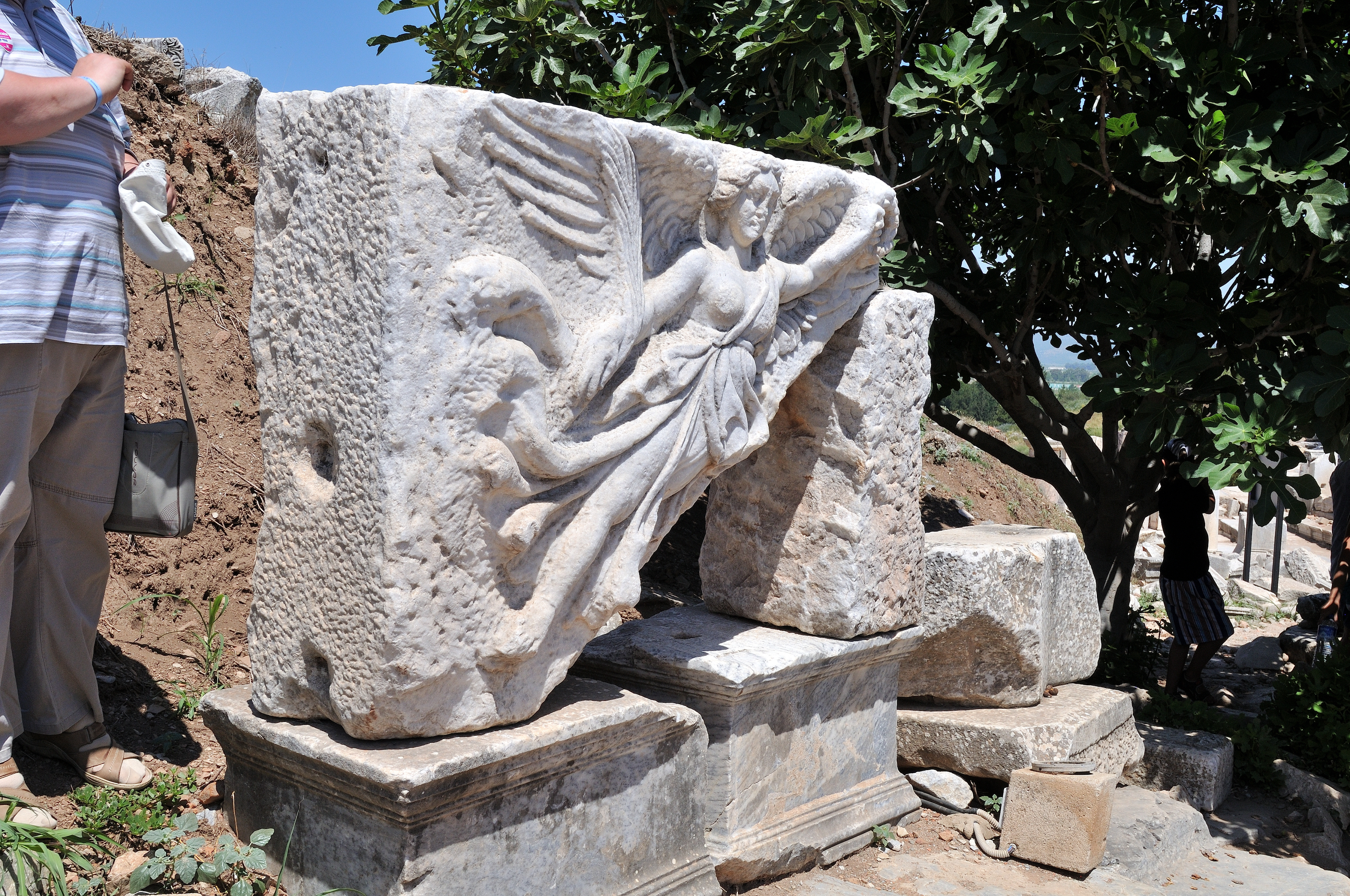 | ニケ (勝利の女神) (11:53) ニケまたはニーケー (古典ギリシア語: Νίκη, Nīkē) と呼ばれ、ギリシア神話に登場する勝利の女神。 英語ではナイキ (Nike) と発音し、世界的スポーツ用品メーカー「ナイキ」社の社名はこの女神に由来する。 ニケの左手には勝利者の頭に載せるための冠を持ち、ニケの羽はナイキのトレードマークになっている。 ちなみにトレードマークの羽は、アメリカの中学生の発想によるものと言われている。 このレリーフは、本来ヘラクレスの門のアーチとして飾られていた。 「北」MAPLay. 2 r |