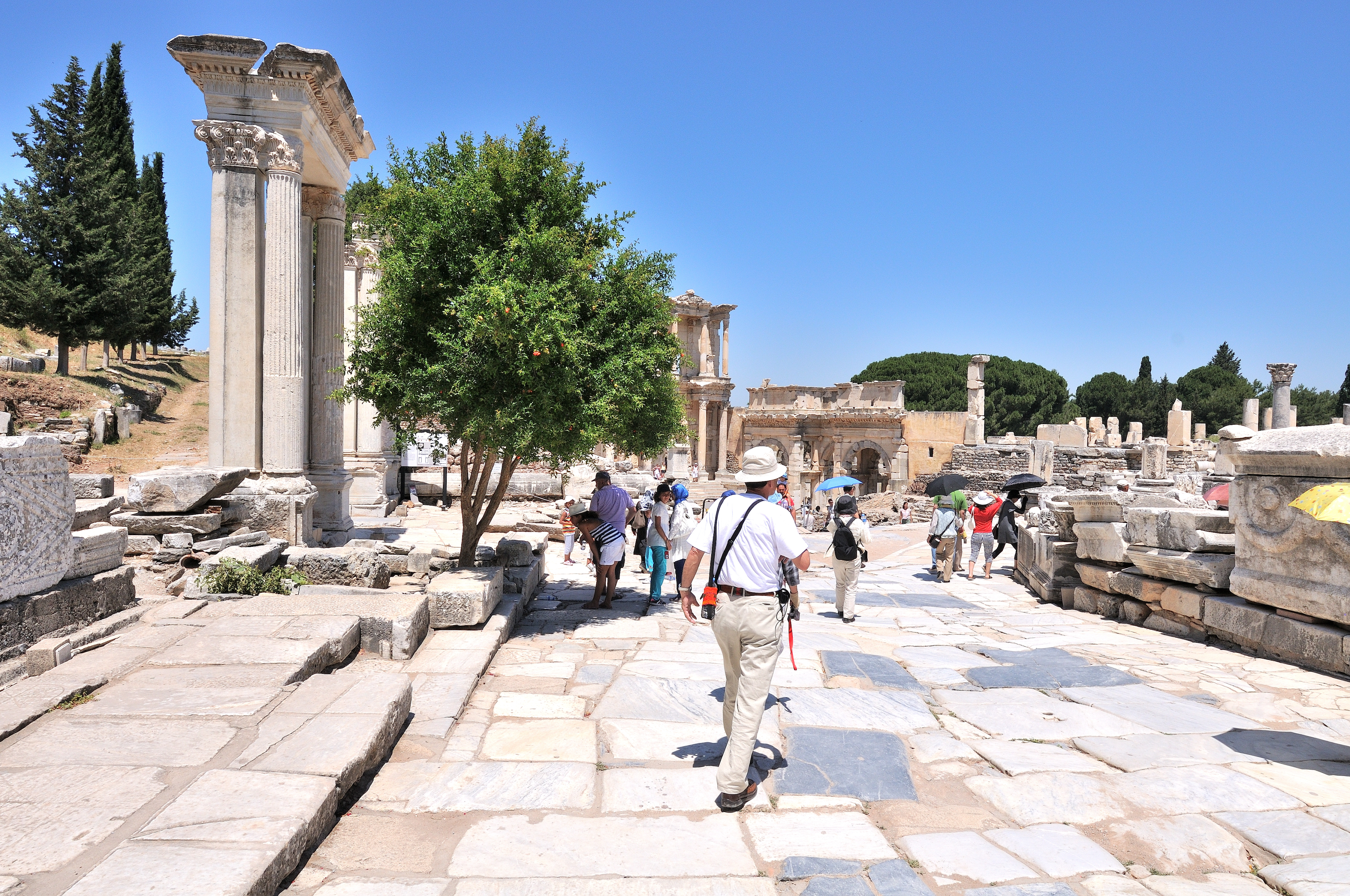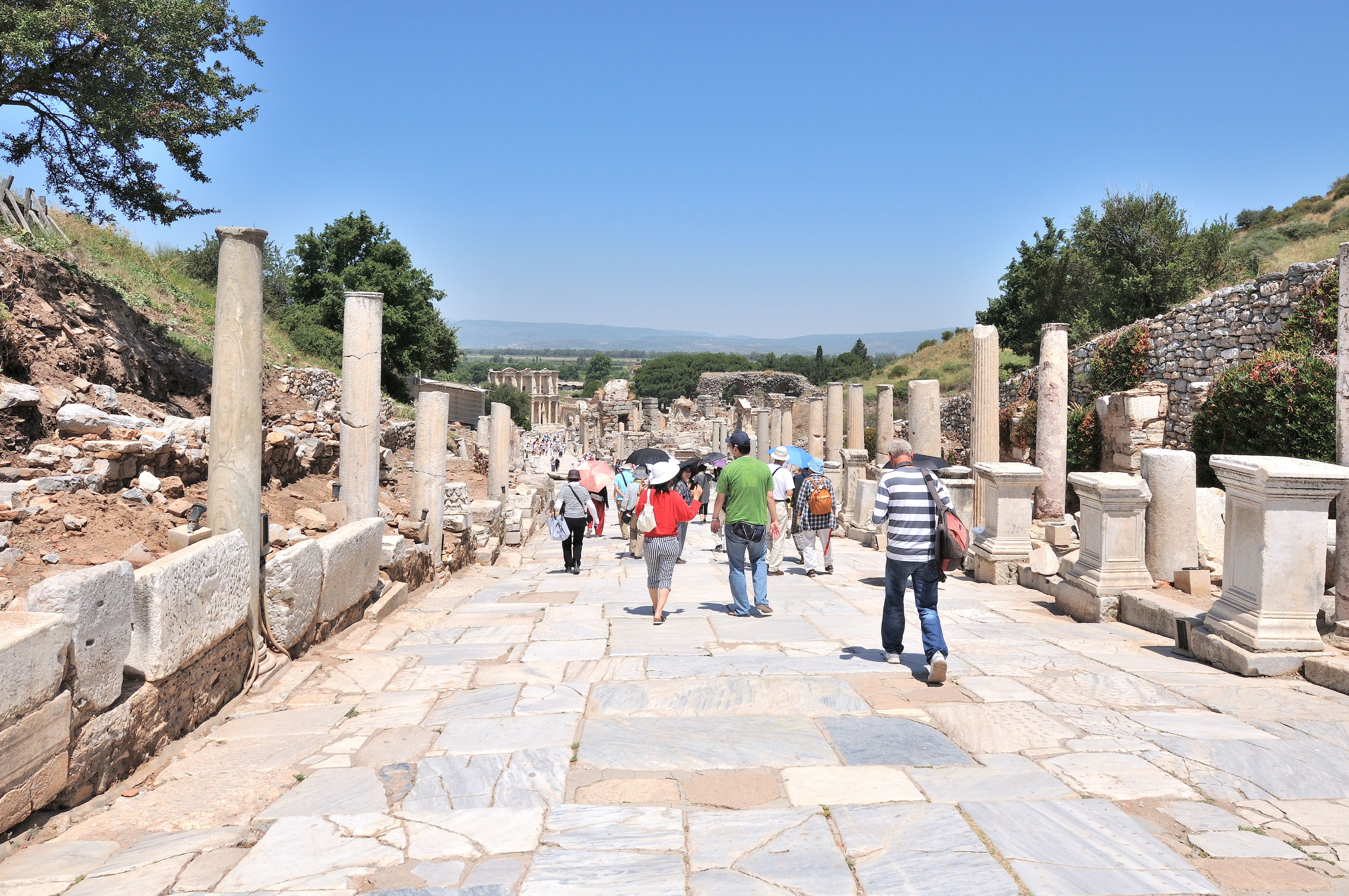 | クレテス通り [Curetes Street] (11:56) 通りの突き当たりには、ひときわ高いケルスス図書館 [Celsus Kütüphanesi] が見えている。 「北西」MAPLay. 2 s |