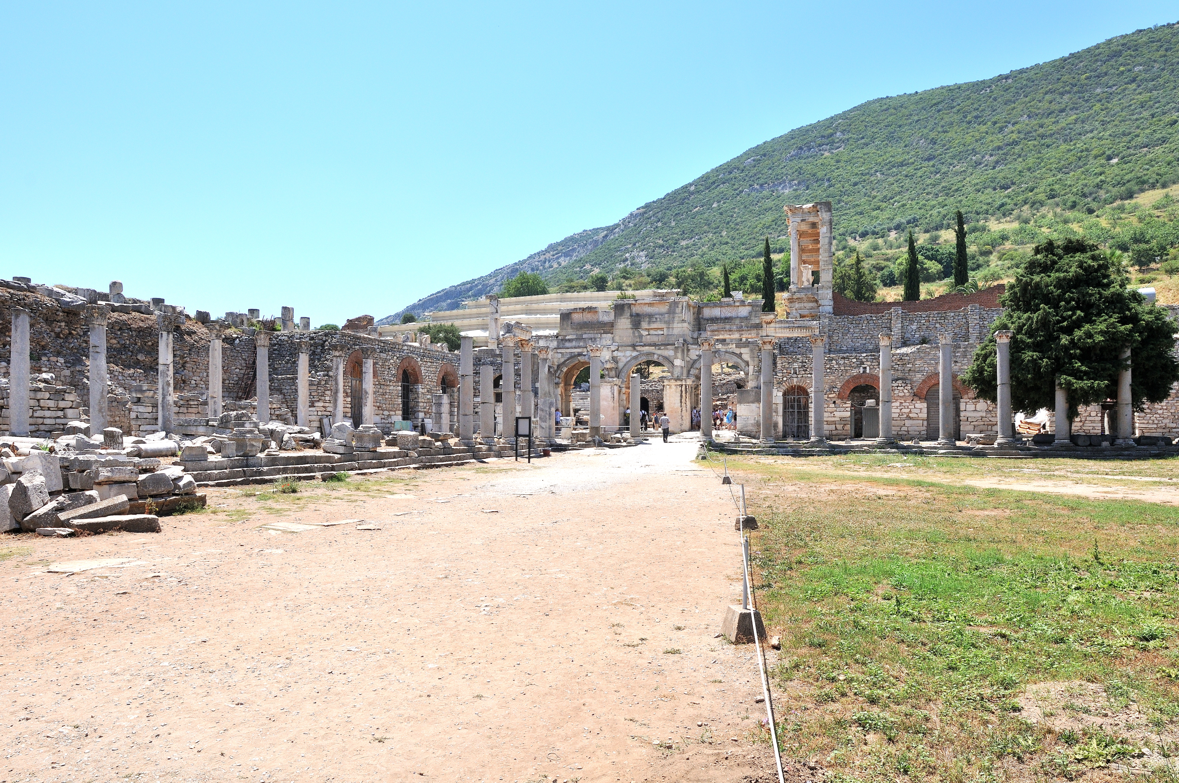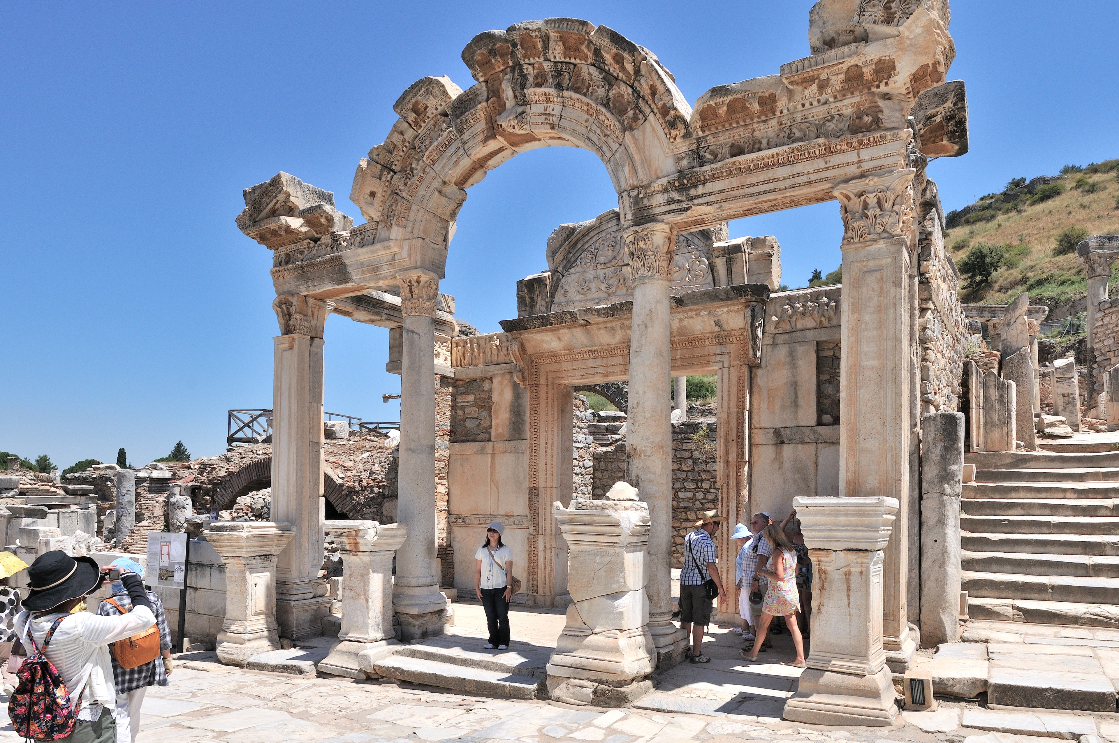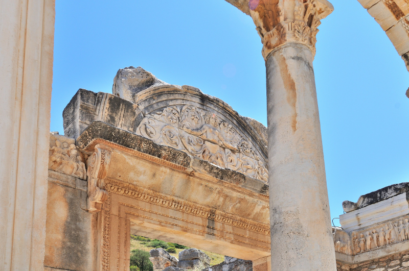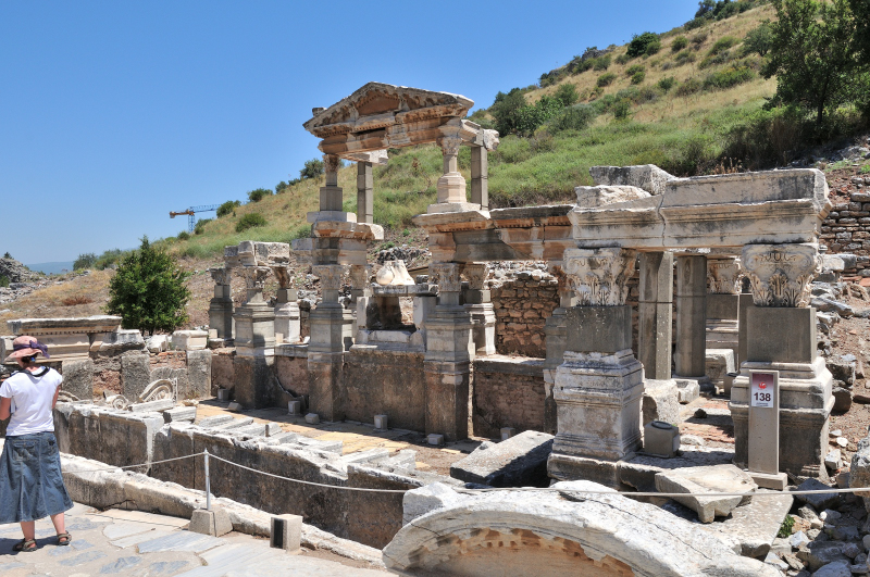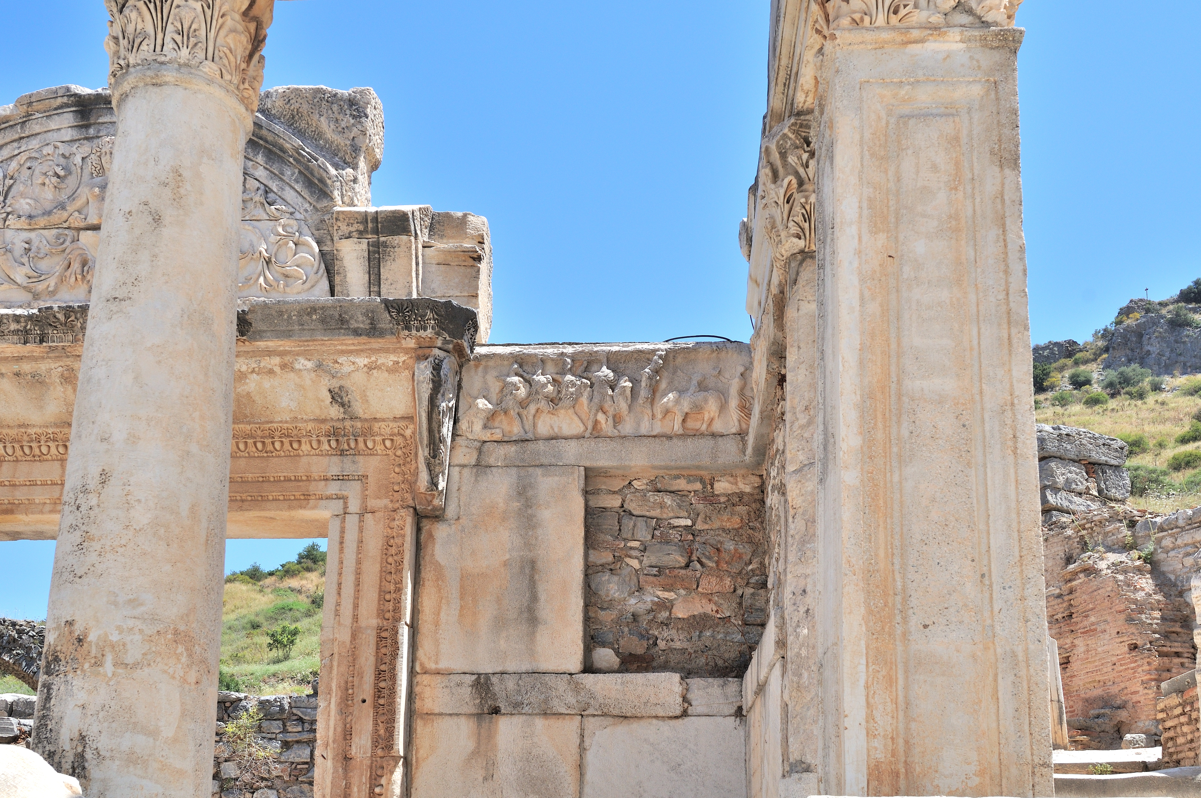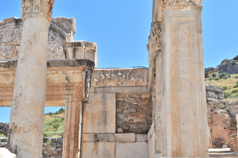 | ハドリアヌス神殿 [Hadrian Tapınağı] (12:10) 奥の門の、左右の小壁にはエフェスの起源伝説が描かれ、右の壁には象に乗って来たギリシアの王子アンドロクロス [Androclus] が彫られており、左の壁には沢山の女神や神の像が彫られている。 「北」MAPLay. 3 A |