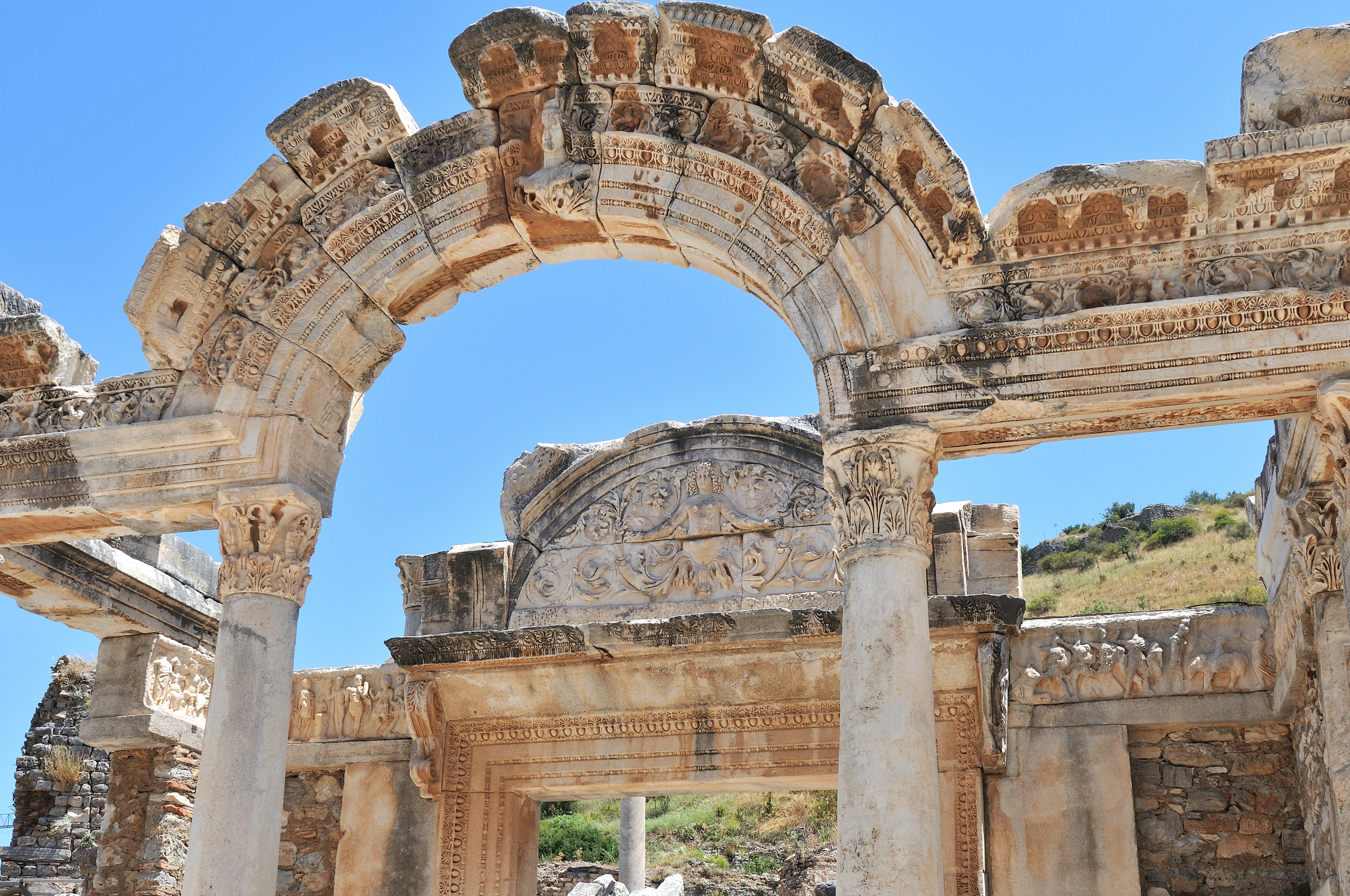 | ハドリアヌス神殿 [Hadrian Tapınağı] (12:10) 奥の門の、左右の小壁にはエフェスの起源伝説が描かれ、右の壁には象に乗って来たギリシアの王子アンドロクロス [Androclus] が彫られており、その右の側壁にはアマゾネスの女性達が彫られている。 左の壁には沢山の女神や神の像が彫られている。 エフェスの起源伝説には二説あり、一説目は前述したアマゾネスに関する説、二説目はギリシアの王子アンドロクロスに関する説で、『紀元前11世紀に、故郷を追われたアテネ王コドロス [Codrus] の王子アンドロクロス [Androclus] がギリシアのパルナッソス山(2547m)麓のデルフォイ/デルフィ [Delphoi/Delphi] のアポロンを祀る神殿で 「デルフォイの神託」 を仰ぐと、「魚と猪とが新しい町になる所を教えてくれる」 と告げられた。 そして、ある土地で料理をすると鍋から魚が跳ね上がり、散らされた火の粉が周囲の薮に燃え広がり、驚いた猪が薮から飛び出した。そこがピオン山(パナユル山)*の麓であった。 王子アンドロクロスは、そこに町を造り、猪を仕留めた所にアルテミス神殿を築いた。』 「北」MAPLay. 3 A *パナユル山 [Panayır dağ] は、古代ギリシアでピオン [Peion] 山と呼ばれていた。 |