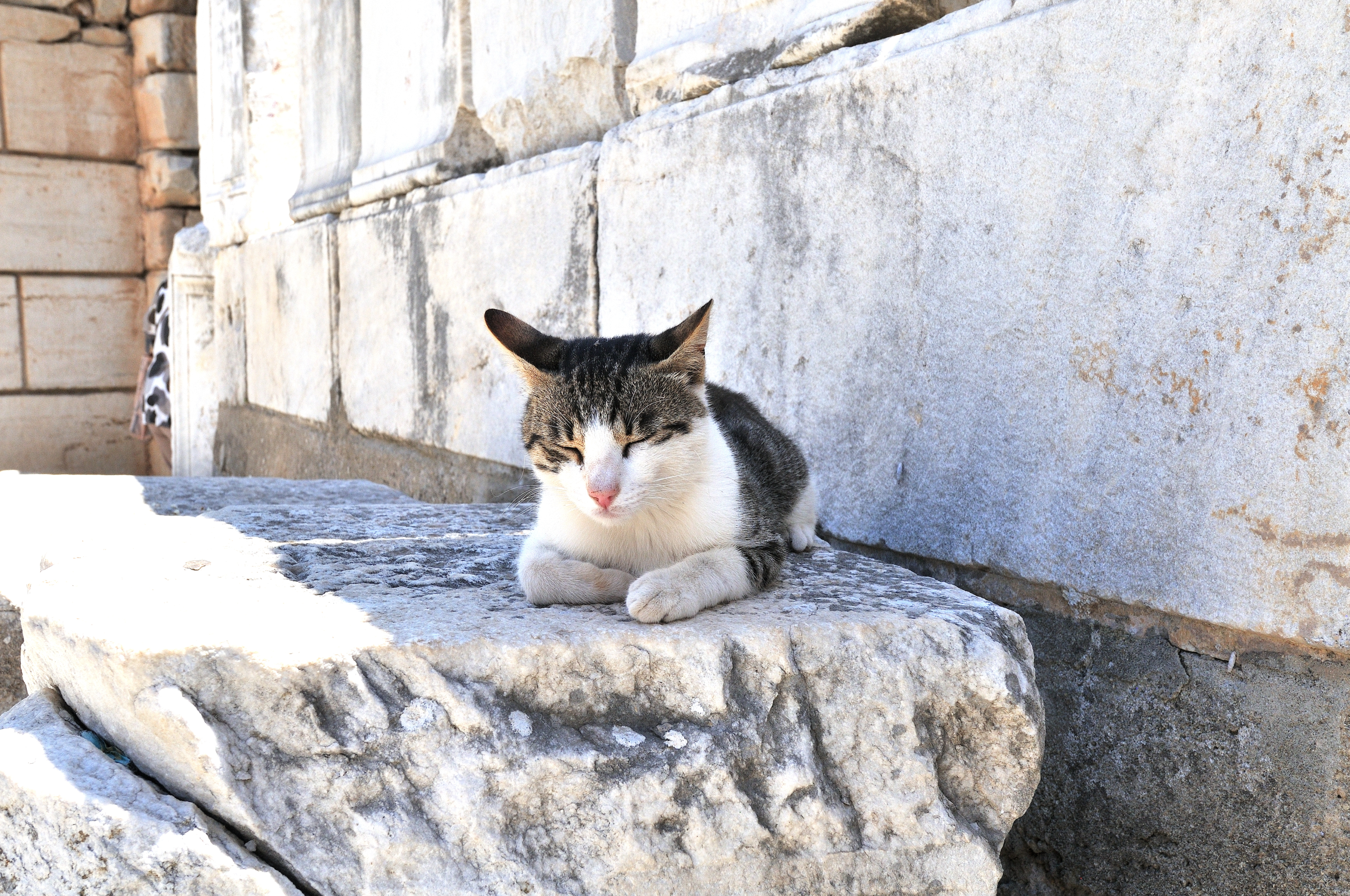 | 遺跡の上でまどろむ猫 (12:11) 遺跡に住みつく猫のことを、遺跡猫と呼ぶ人もいる。 面倒見のいい人達が多いのでしょう、みんな人なつっこい。 猫に関して次のような話がある。 『ムハンマドは大変な猫好きであったといわれ、ムエザ [معزة] という猫を飼っていた。 ある日ムハンマドが外出しようとすると、着ようと思っていた服の上で猫が眠っていた。 ムハンマドは猫を起こすことを忍びなく思い、服の袖を切り落とし片袖のない服で外出したという。 ムハンマドが猫好きであったことから、イスラム教徒には猫好きが多いといわれ、とくに額にM字の模様が入った猫は「ムハンマドの猫」と呼ばれ珍重されている。 これは、あるときムハンマドが可愛がっていた猫の額に触れるとムハンマドの名前の頭文字である「M」の模様が浮かび上がったという逸話に基づいている』 「東北東」MAPLay. 3 A |