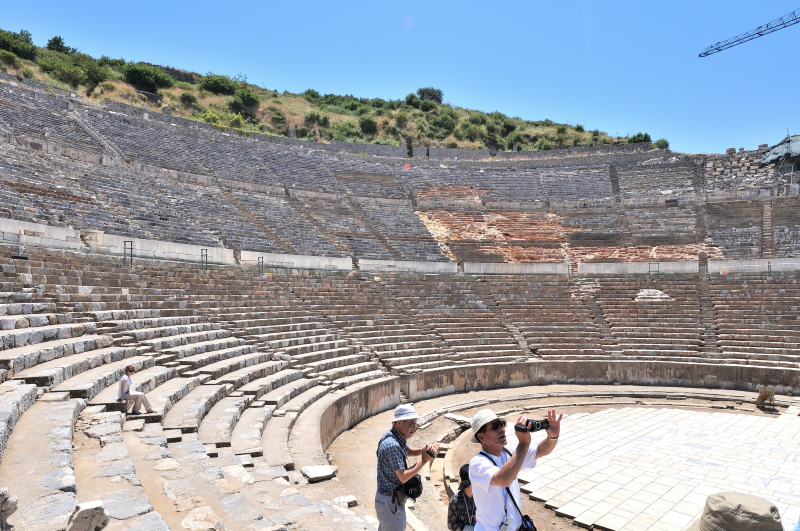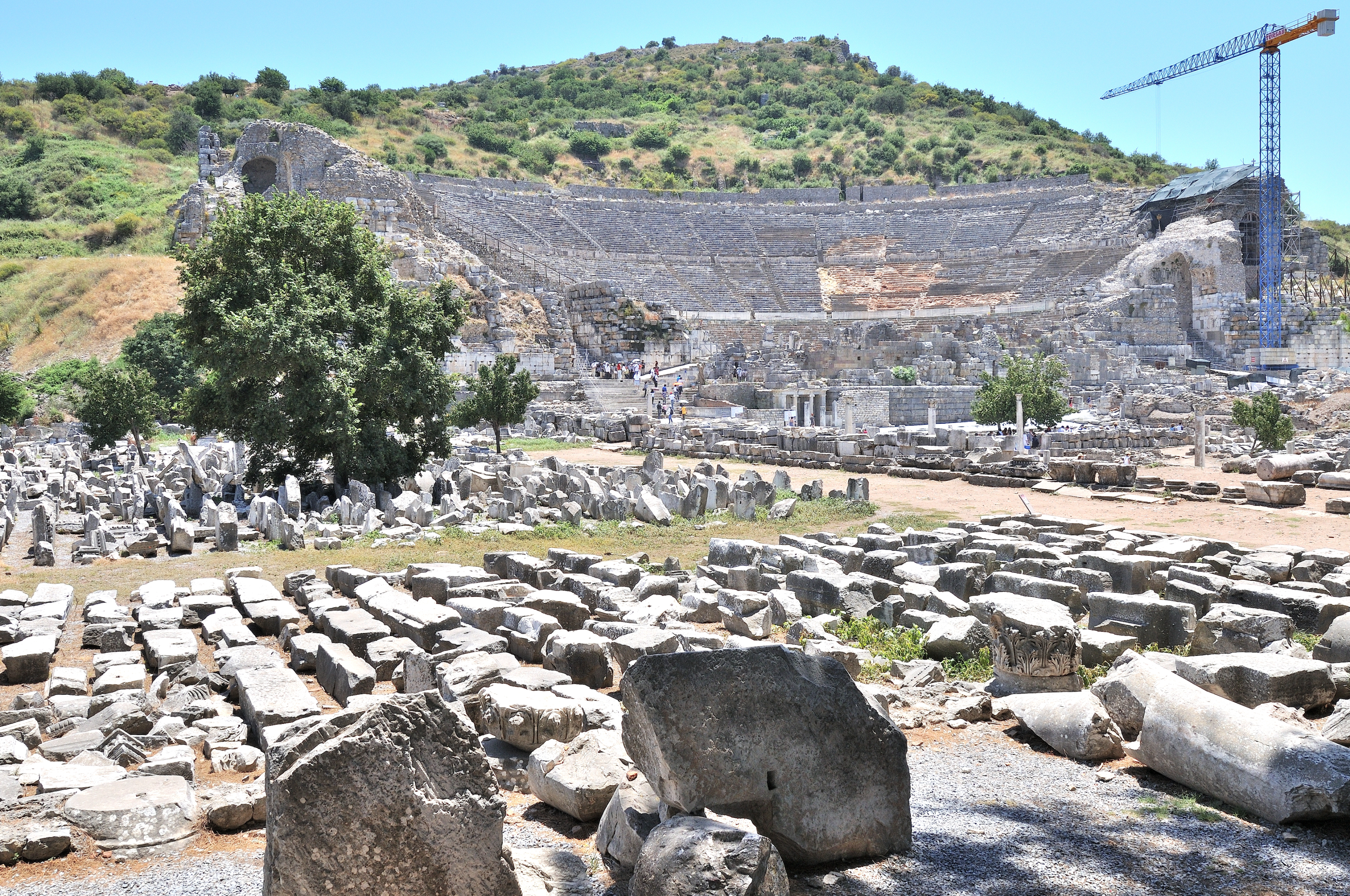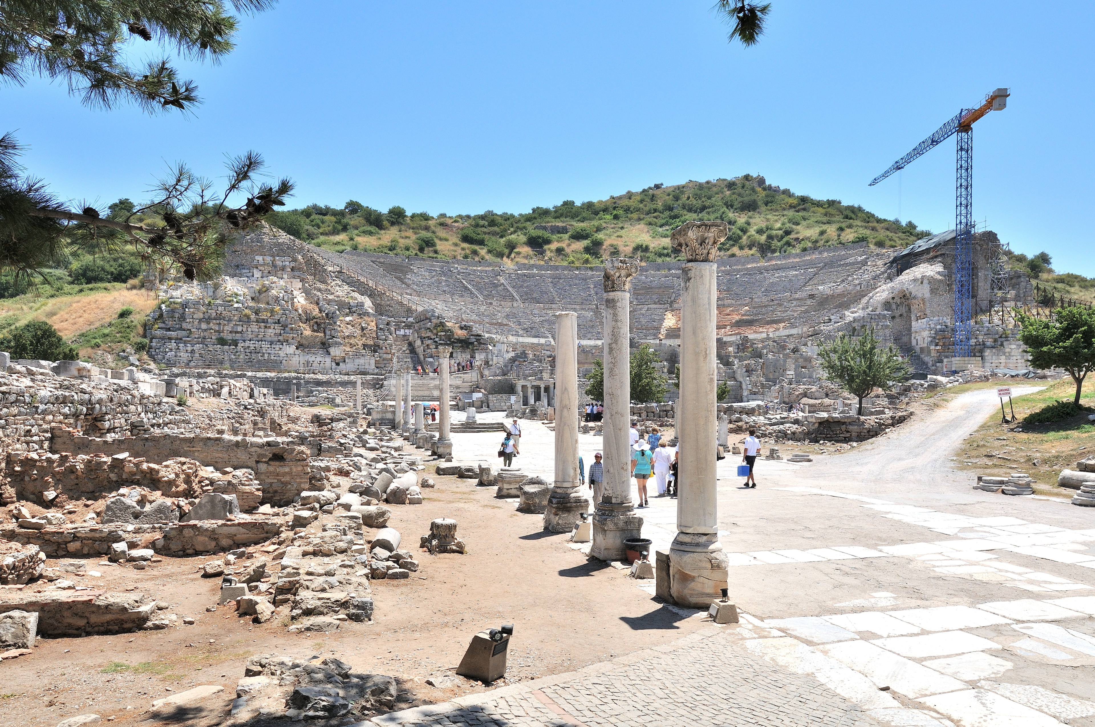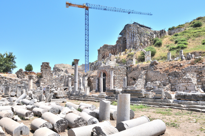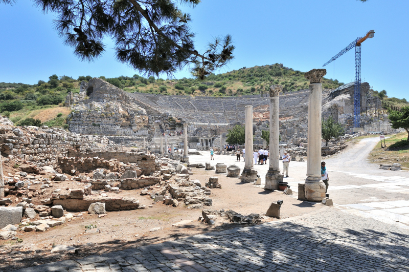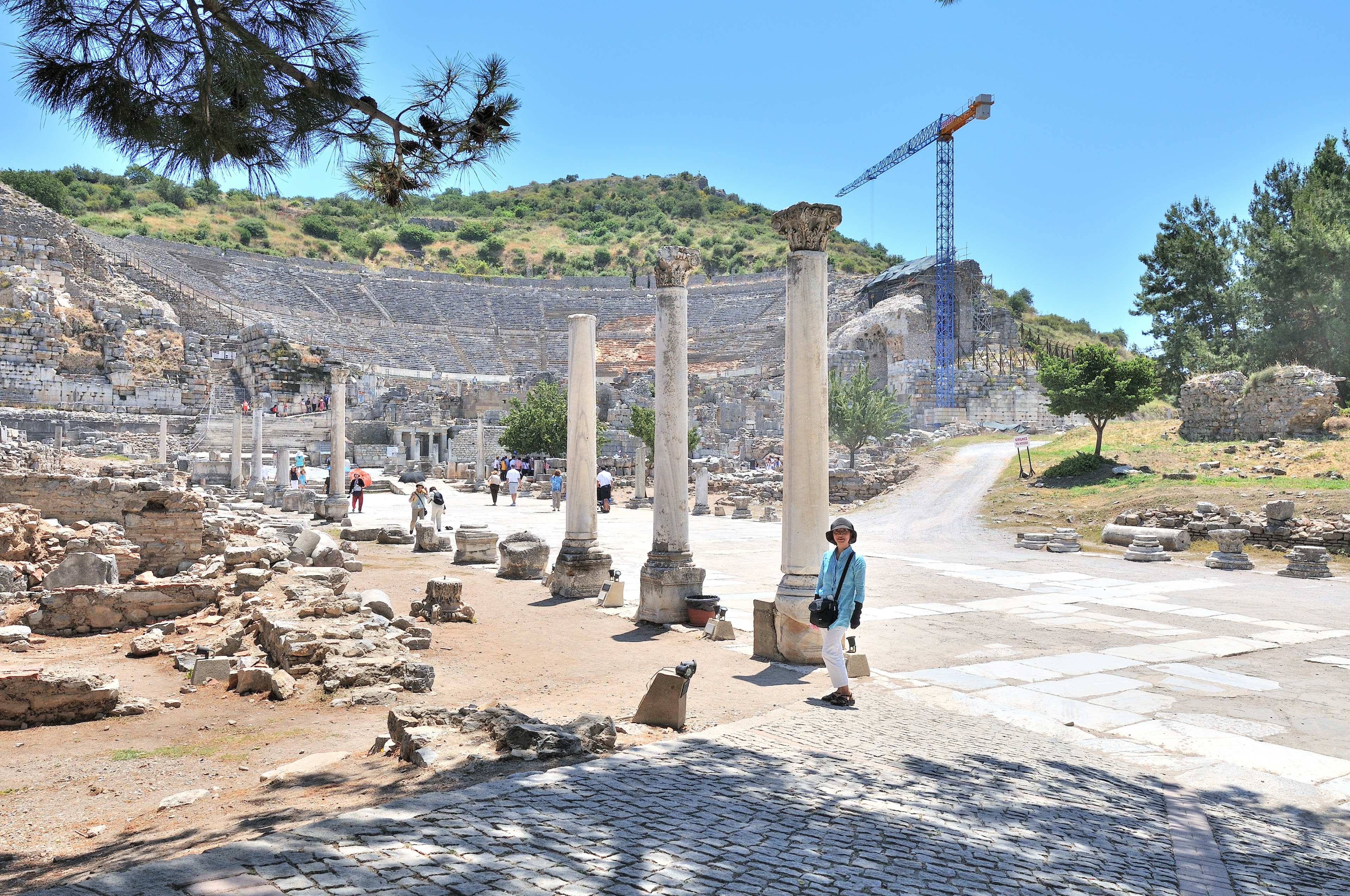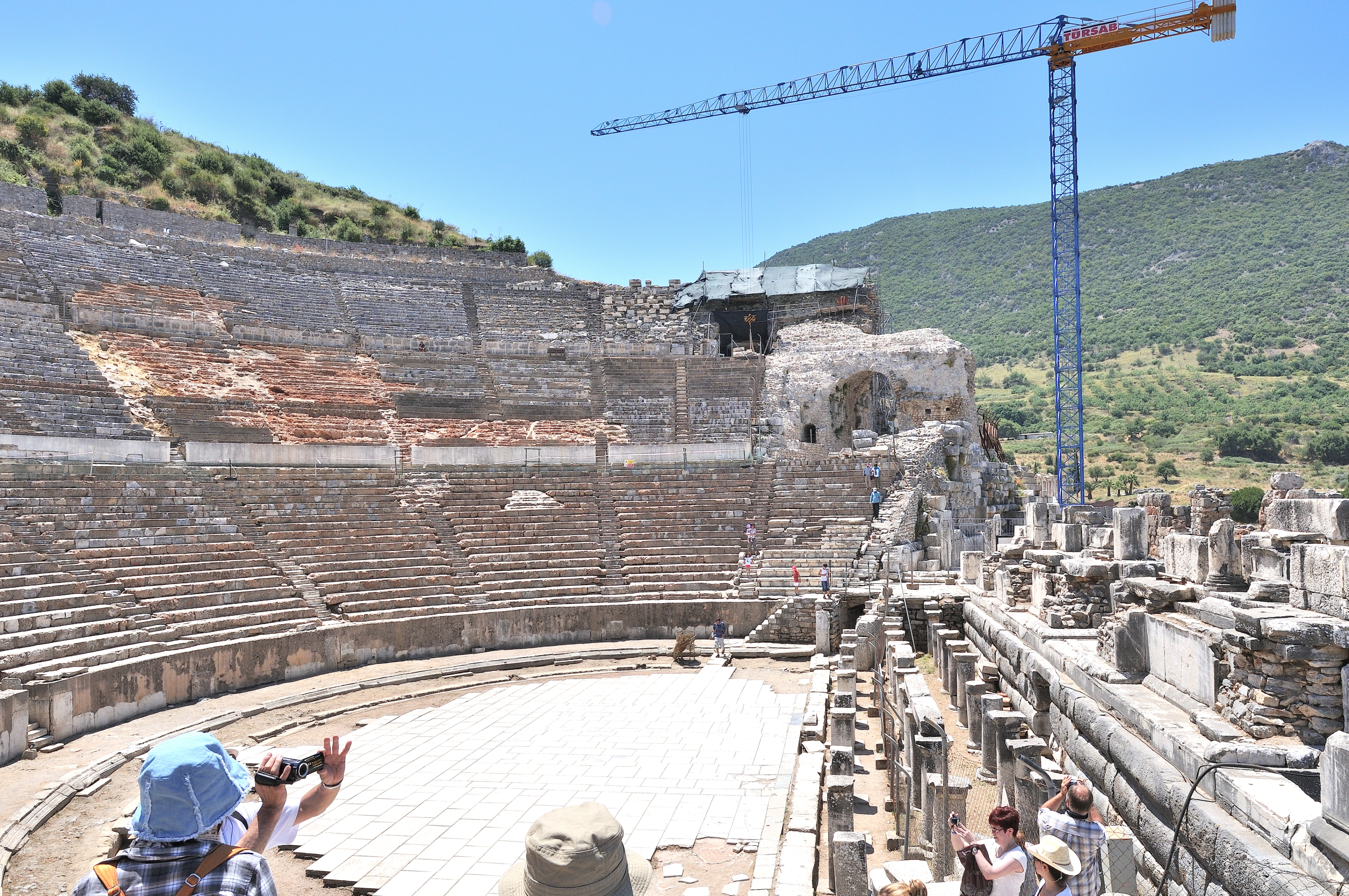 | エフェス円形劇場 [Efes Anfi Tiyatro] (12:32) クレーンの向こうに見えているのが、ピオン山 (パナユル山)* の麓にある円形劇場。 *パナユル山 [Panayır dağ] は、古代ギリシアでピオン [Peion] 山と呼ばれていた。 「北東」MAPLay. 3 I |