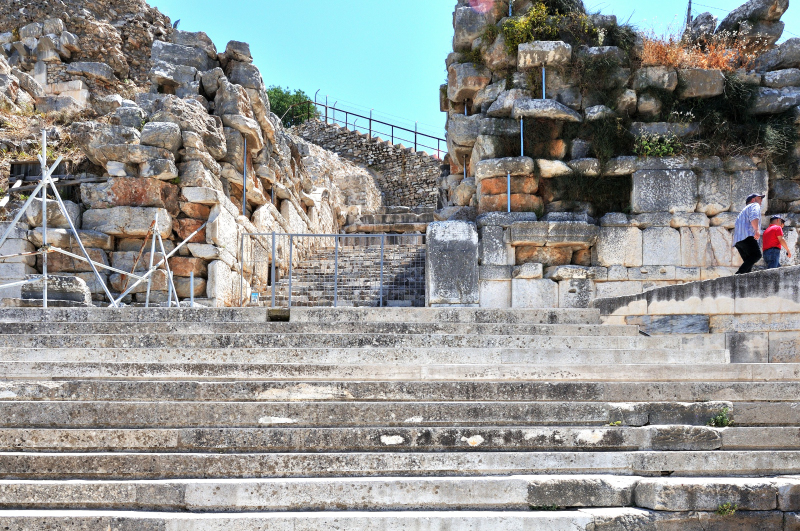 | 左は上のアゴーラ (広場) [Agora] 、右はオデオン [Odeon] (11:36) 上のアゴーラは商業活動、政治・司法の集会、宗教儀式、その他の社会活動が行われるオープン・スペースで、町の中枢部になっていた。 オデオンは300人程度の代表者会議やコンサートなどに使用されていた。 「北西」MAPLay. 2 g |