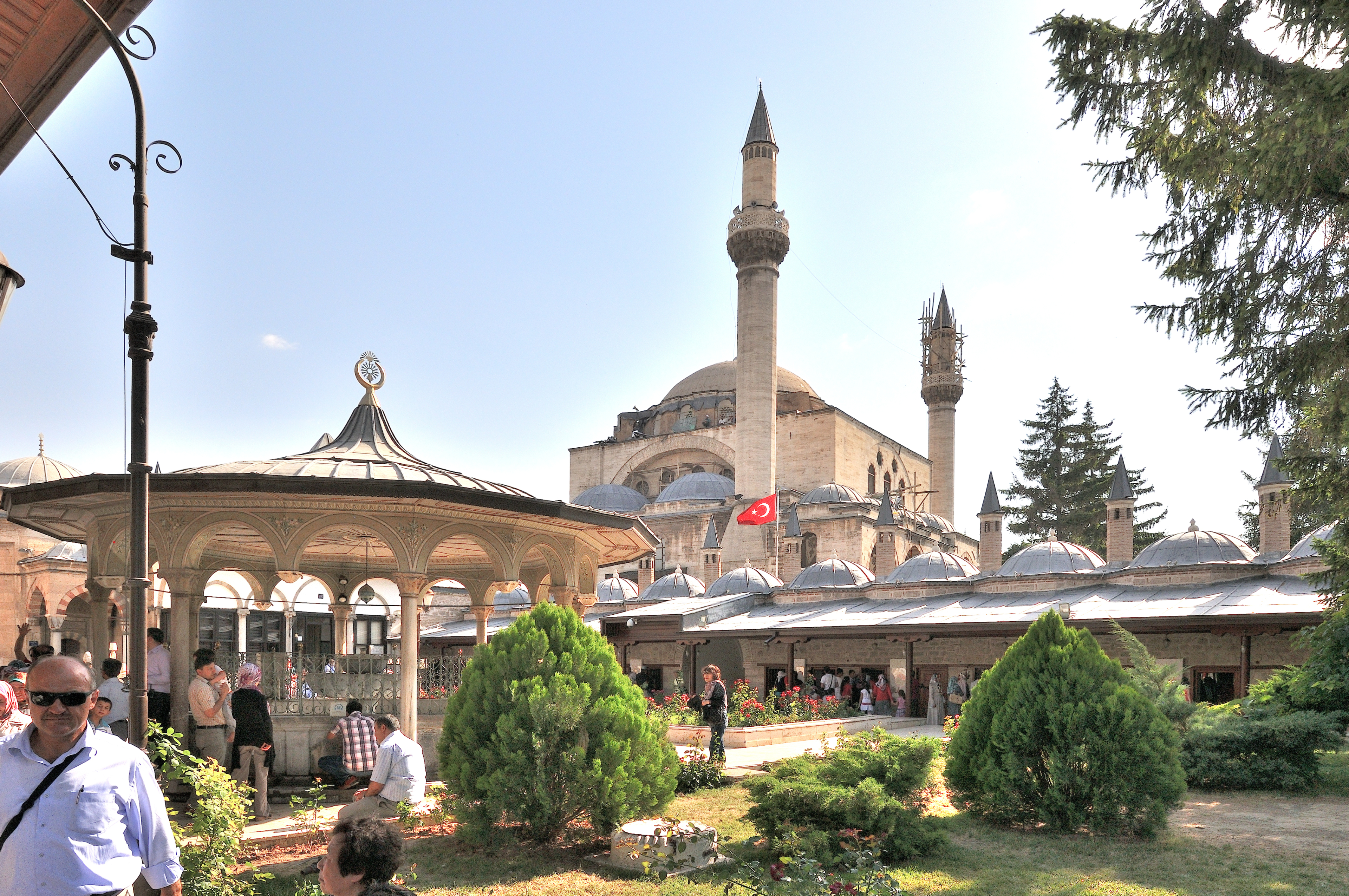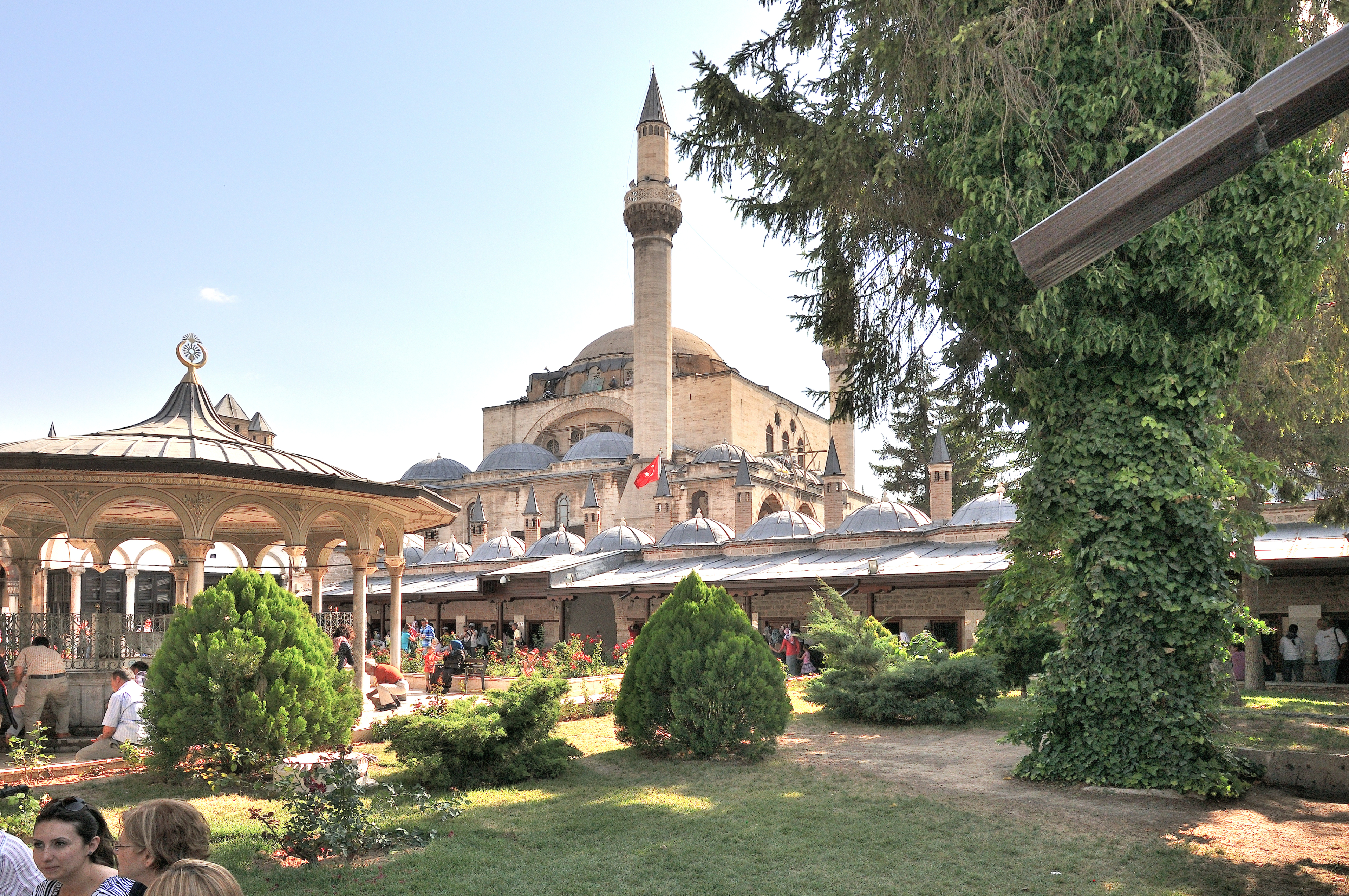 | メヴラーナ博物館 [Mevlana Müzesi] (16:55) 中央に見えるモスクは、メヴラーナ博物館とは関係なく、隣にある セリミエ・モスク [Selimiye Mosque] 。 その手前に連なって見える小房は、メヴラーナ博物館の小房*1で、スルタン・ムラト三世が1584年にデルヴィーシュたちを住まわせるために建てた。 ちなみに、トルコ国旗の左手前にデルヴィーシュの扉 [Dervişan Kapısı]*2 がある。 「南西」MAPLay. 3 B *1 "見取り図" (14番) *2 "見取り図" (1番) |