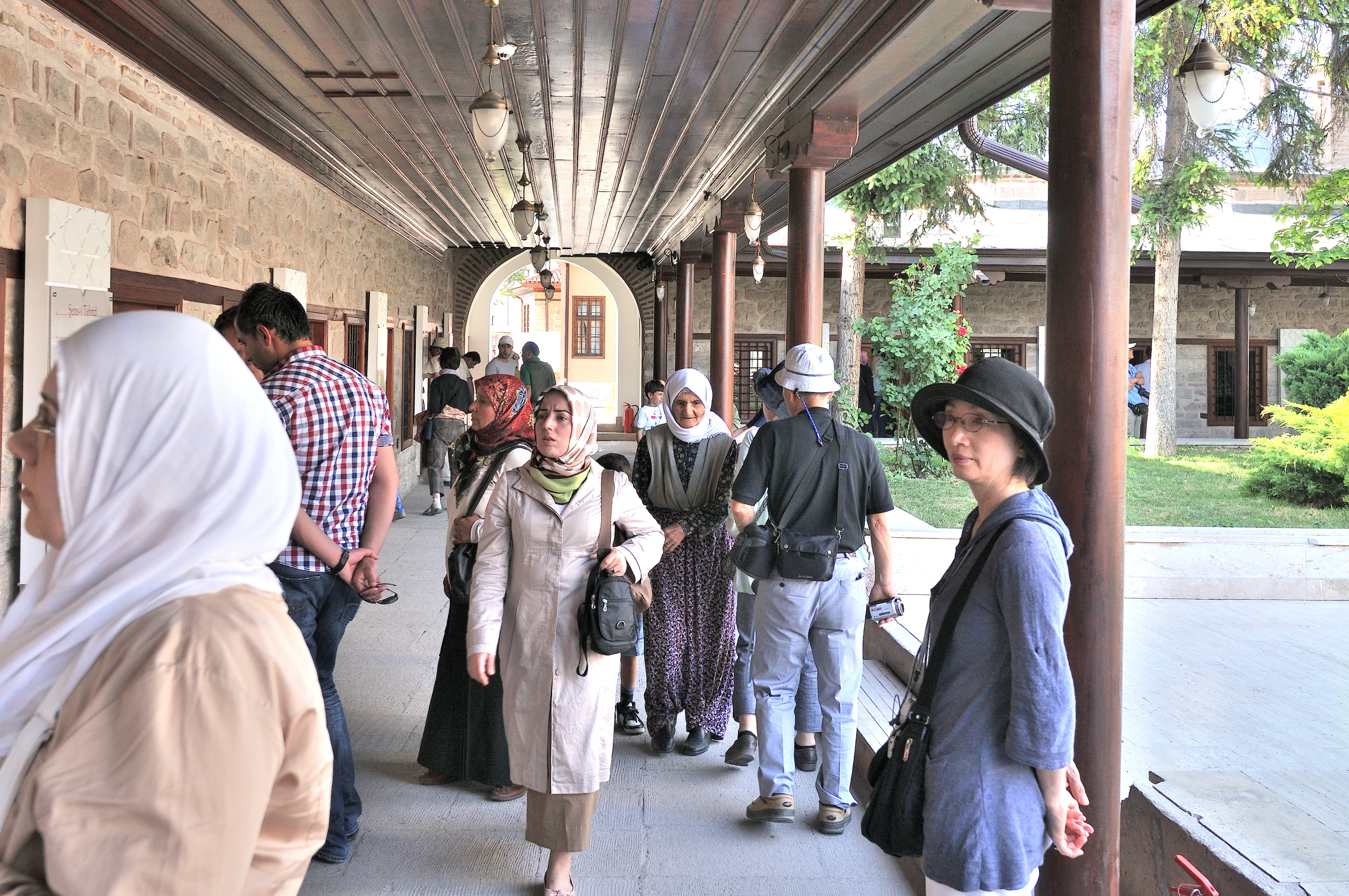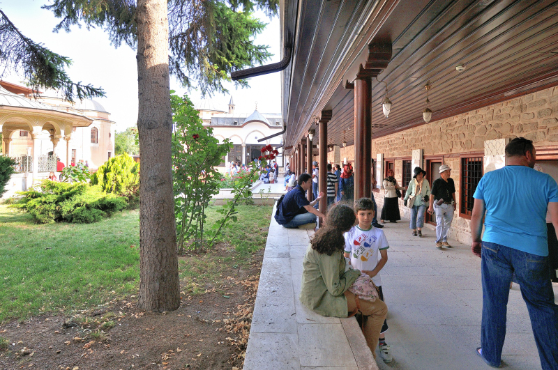 | メヴラーナ博物館 [Mevlana Müzesi] (17:31) 右に連なる小房は、スルタン・ムラト三世が1584年にデルヴィーシュたちを住まわせるために建てた小房。 中央に見える白い建物は 台所*で、修道所が博物館として使用されるまで食事の用意をしていたこの場所は、1990年に実施された改装により、人形を使用して当時を再現している。 デルヴィーシュたちは、炊事を始めとして、1001日間にわたる修行を行い、祈りや宗教音楽、詩歌や踊りを実践するなかで、倫理観や行動規範、信念を学んでいた。 この修行の後、彼らは教団の一員として認められた。 「南」MAPLay. 3 G * "見取り図" (13番) |