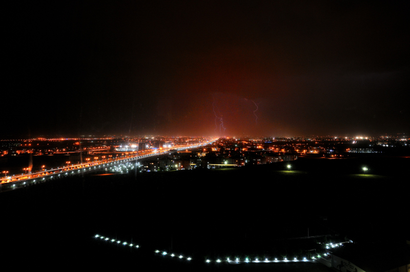 | リクソス コンヤ [Rixos Konya] からの眺望 (21:42) 13階客室から撮影、中央部は稲妻。 「南」MAPLay. 3 Q |